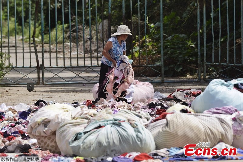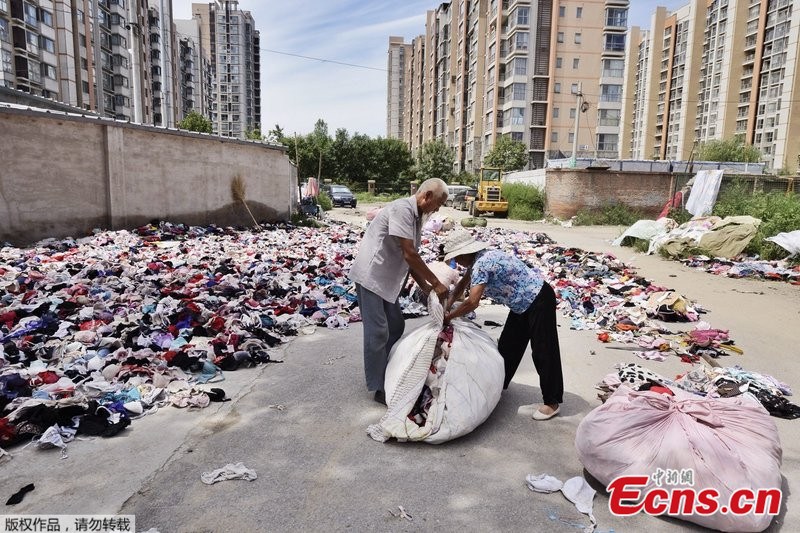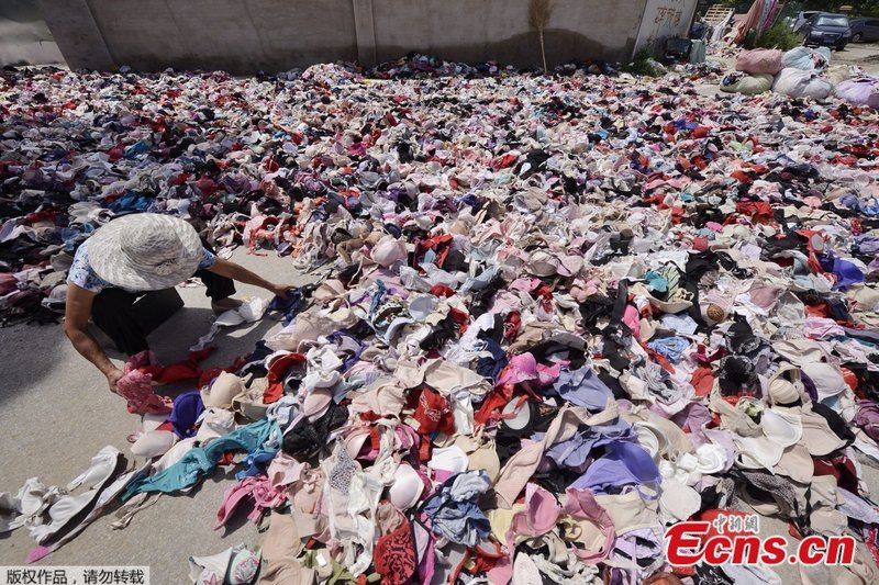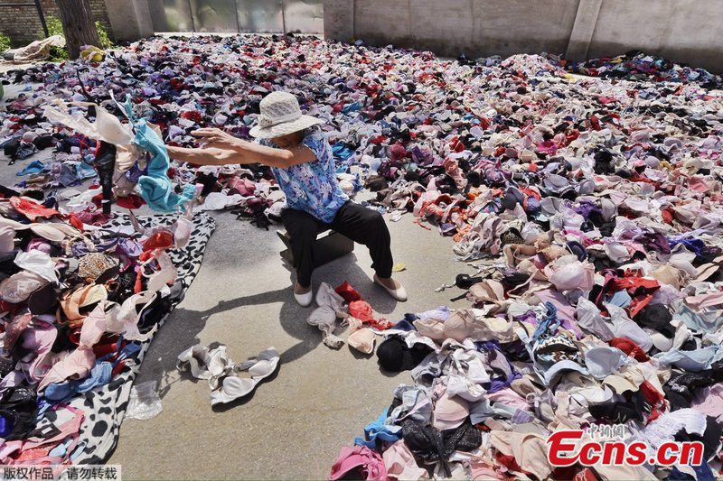 A large number of used bras are seen at a waste recycling station in Beijing on August 7, 2014. According to the station owner Mr. Wang, the used bras were mainly collected from Beijing's colleges and universities and they will be destroyed and usually recycled to produce insoles, knee pads and carpets. [Photo/CFP]