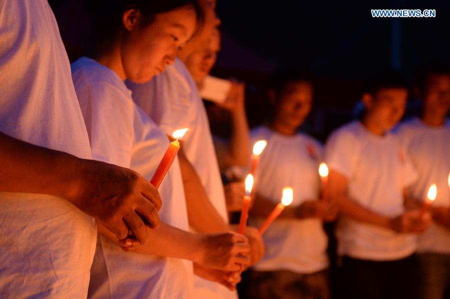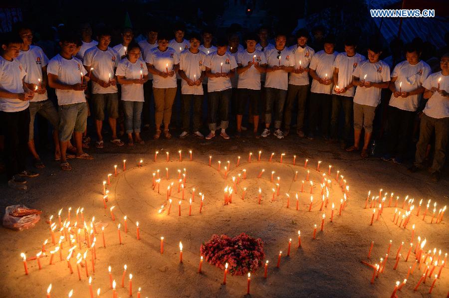 People light candles to mourn for the victims after a 6.5-magnitude earthquake in Longtoushan Town under Ludian County of Zhaotong, southwest China's Yunnan Province, Aug. 8, 2014. Death toll from the quake that struck Yunnan on Sunday afternoon has risen to 617 as of 3:00 p.m. Friday. (Xinhua/Hu Chao)