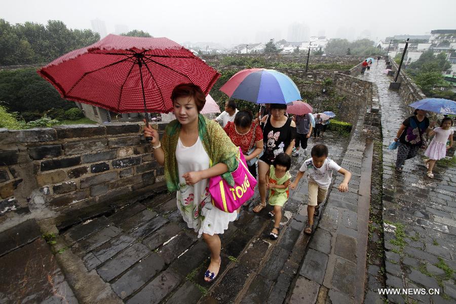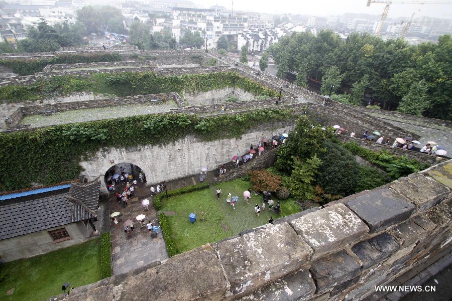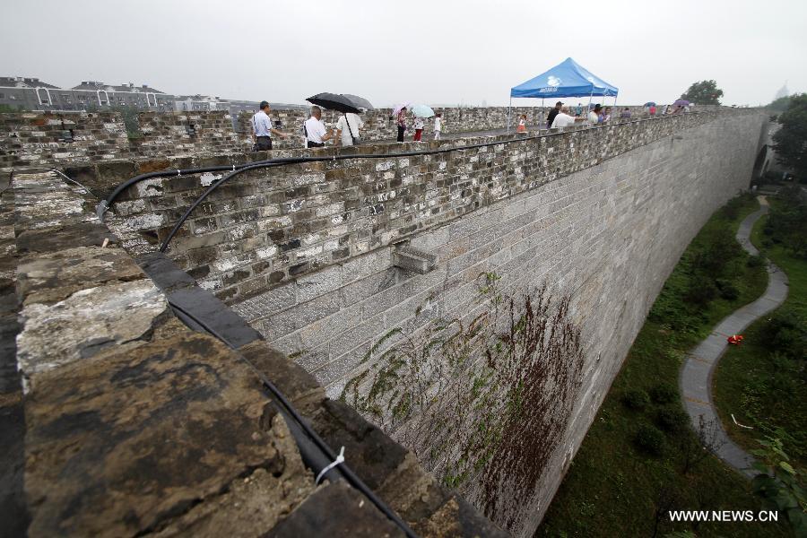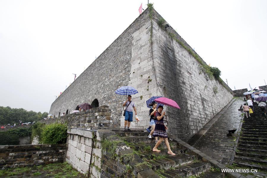 Tourists visit the ancient city wall of Nanjing, capital of east China's Jiangsu Province, Aug. 8, 2014. Nanjing's city wall was constructed between 1366 and 1386, the early years of the Ming Dynasty (1368-1644). Once the dynasty's capital, Nanjing used to be enclosed by four layers of stone-brick city walls. After six centuries of natural erosion and human destruction on purpose, the length of the remaining city wall totals 25 kilometers today, which still makes a world record. (Xinhua)