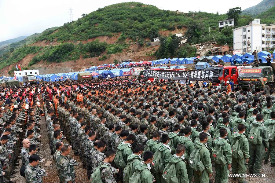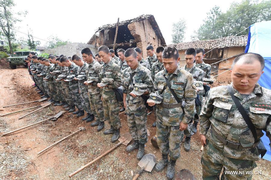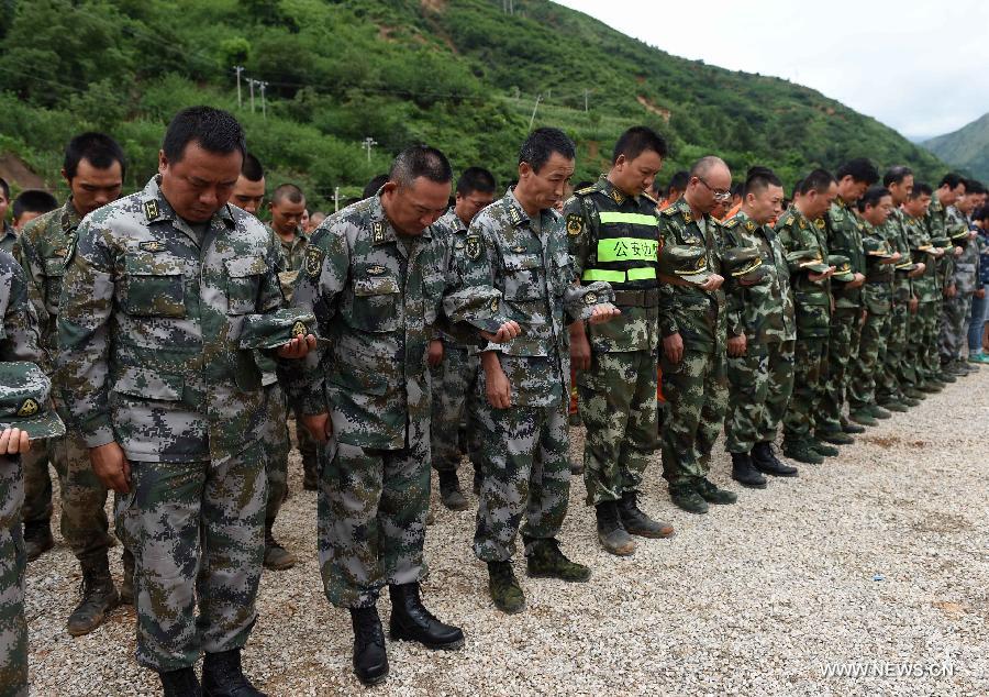 People mourn the quake victims at the memorial service in Ludian County, southwest China's Yunnan Province, Aug. 10, 2014. A 6.5-magnitude quake that struck Ludian County on Aug. 3 has left 617 people dead and 112 missing. (Xinhua/Hu Chao)