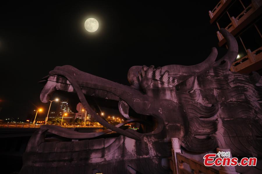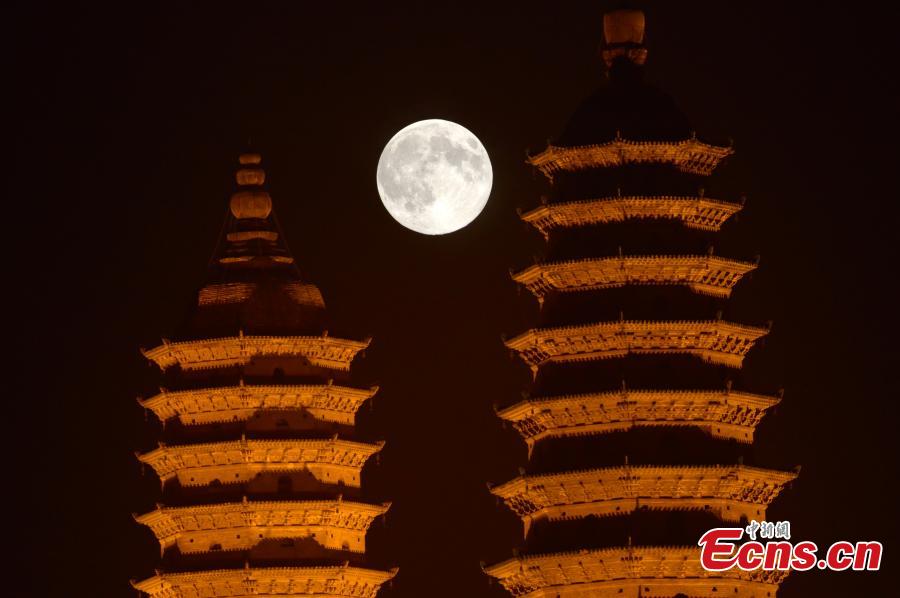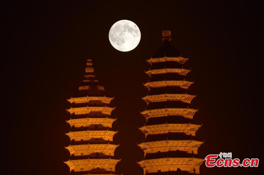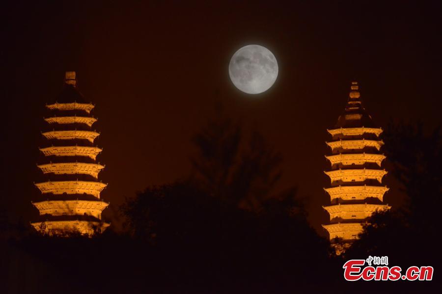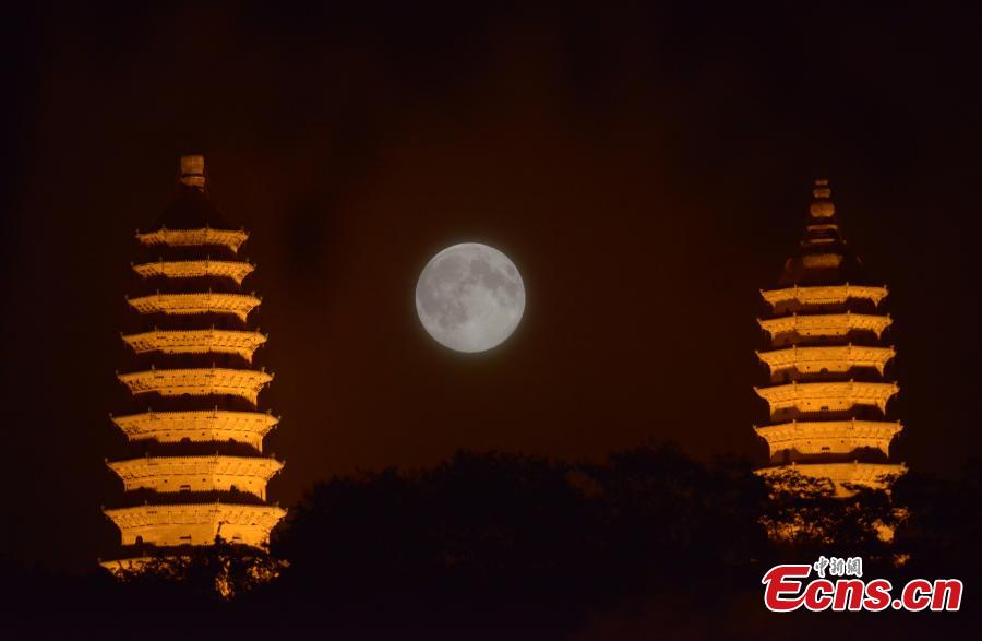 Photo taken on August 10, 2014 shows the "supermoon" observed at Shuangta Temple in Taiyuan city of north China's Shanxi province. The "supermoon," technically known as "perigee moon," appears when the moon is in its closest to Earth in its orbit, making it appear much larger and brighter than usual. [Photo: China News Service / Liu Zhankun]