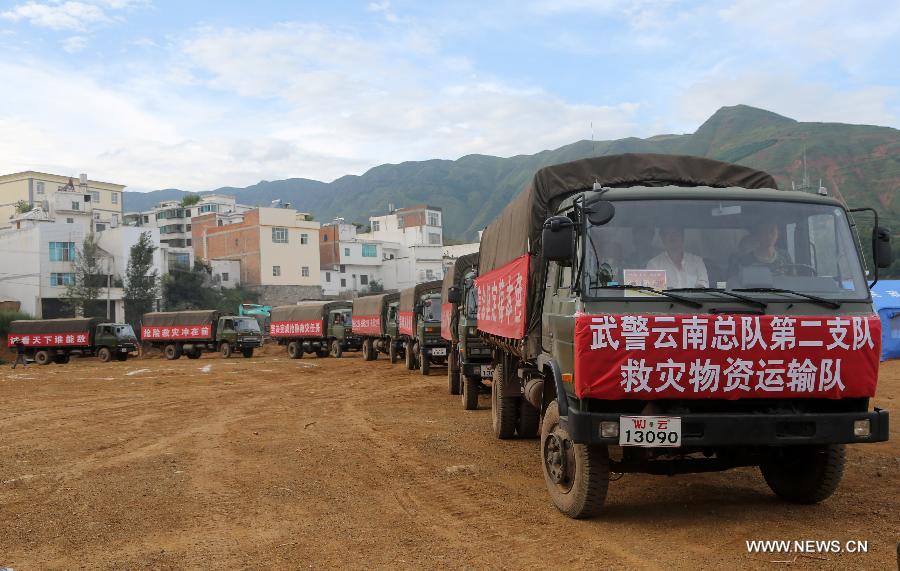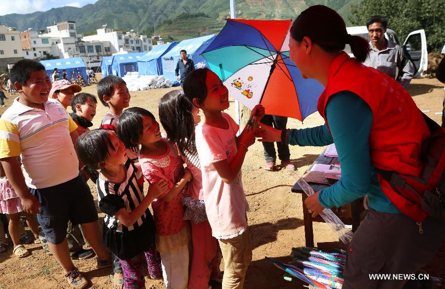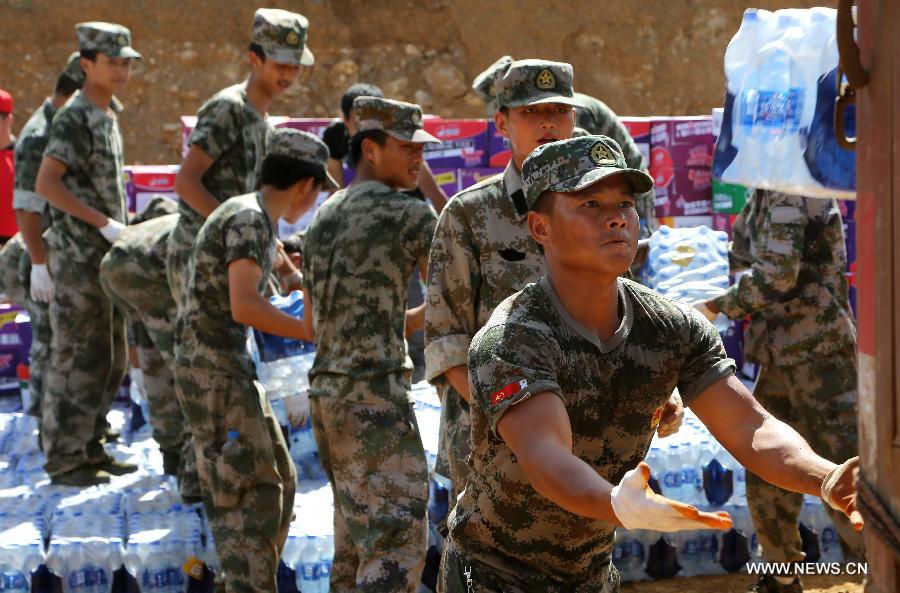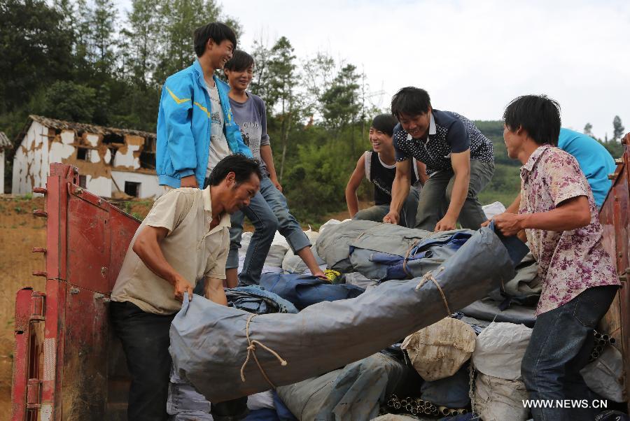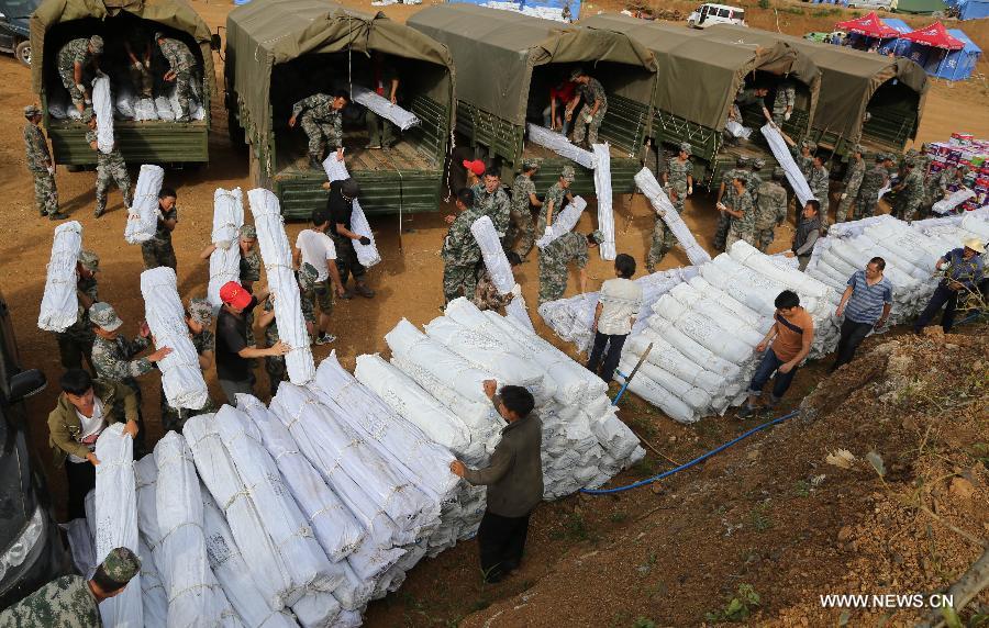 The affected people receive disaster relief materials after a 6.5-magnitude earthquake in Ludian County of Zhaotong, southwest China's Yunnan Province, Aug. 10, 2014. Disaster relief work is in progress after the earthquake struck Yunnan. Civilians in temporary settlements within areas that are most severely affected have already had access to fresh meal and potable water. (Xinhua/Pei Xin)