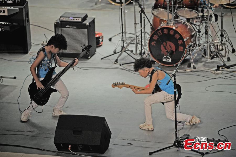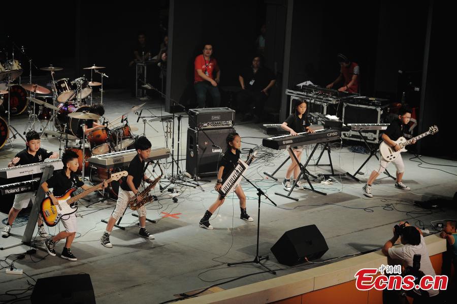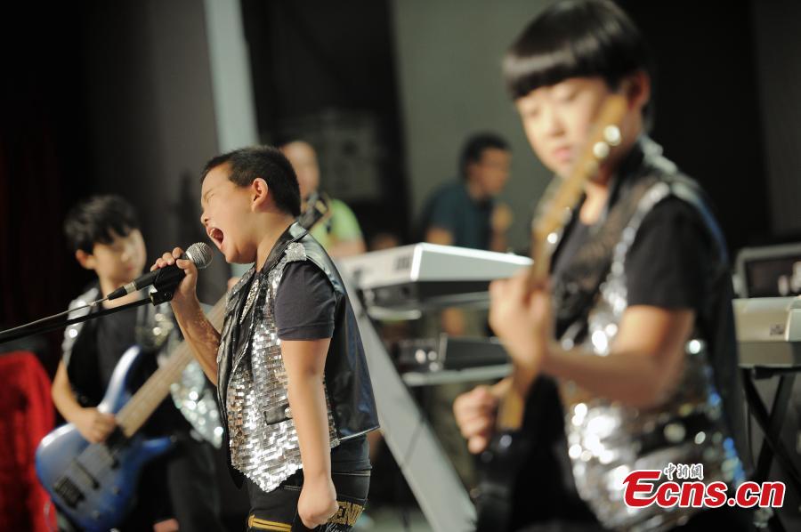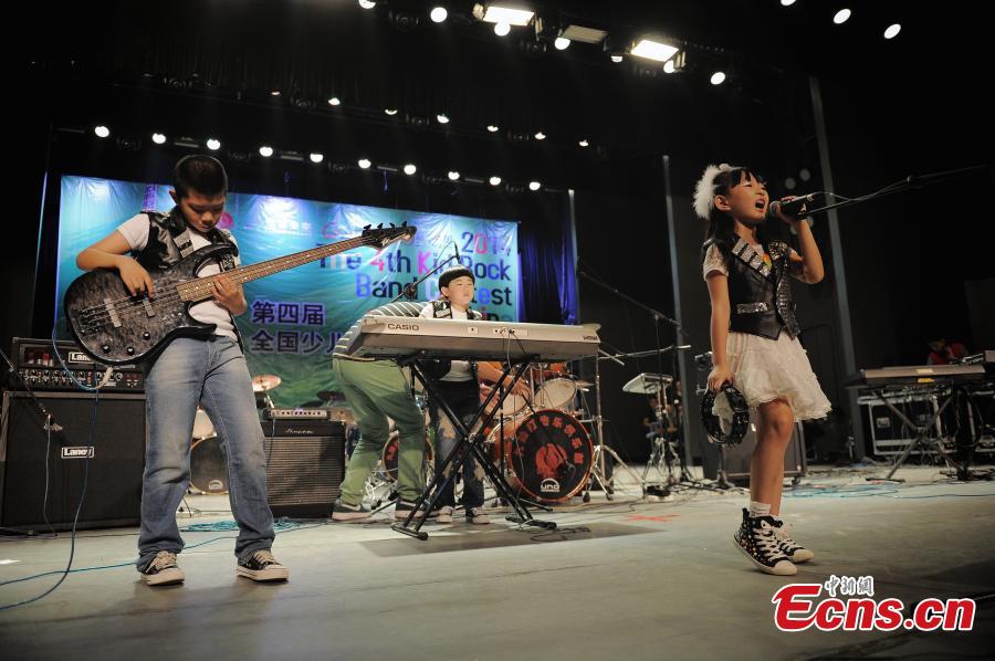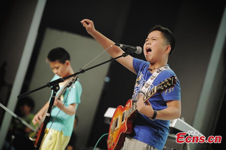 Little rock and roll musicians compete on stage of a national rock music contest for children in Tianjin municipality on August 10, 2014. The event has attracted 16 teams from provinces of the country. [Photo: China News Service/ Tong Yu]