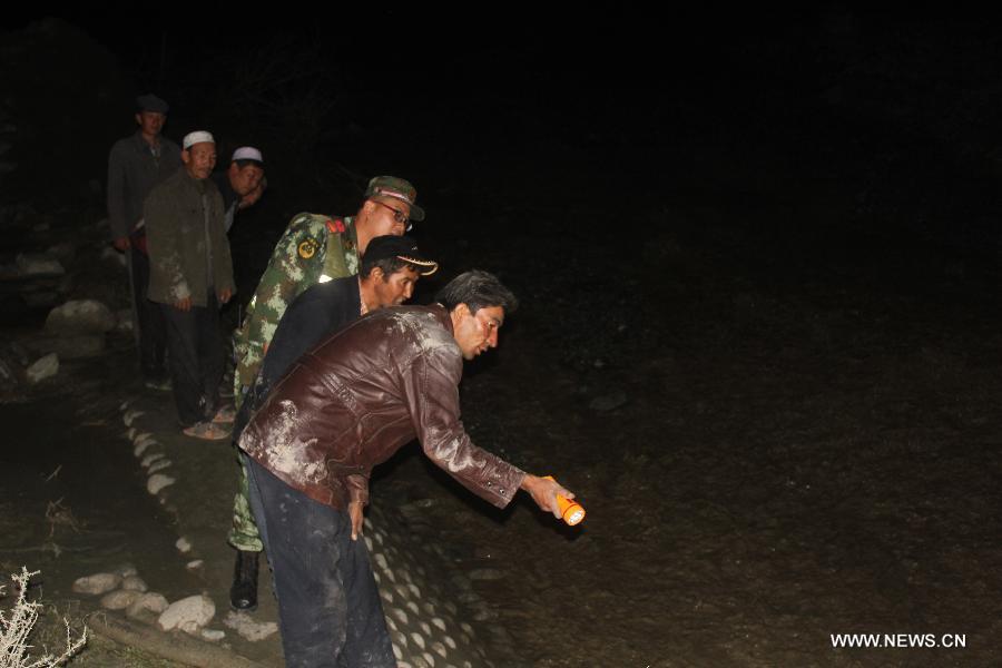Photo taken on Aug 10, 2014 shows vehicles stranded due to mudslide at a section of National Highway 314 in northwest China's Xinjiang Uygur Autonomous Region. A mudslide hit the highway on Sunday night, causing one person dead, five others injured and at least 500 vehicles stranded. (Xinhua/Ma Jian)