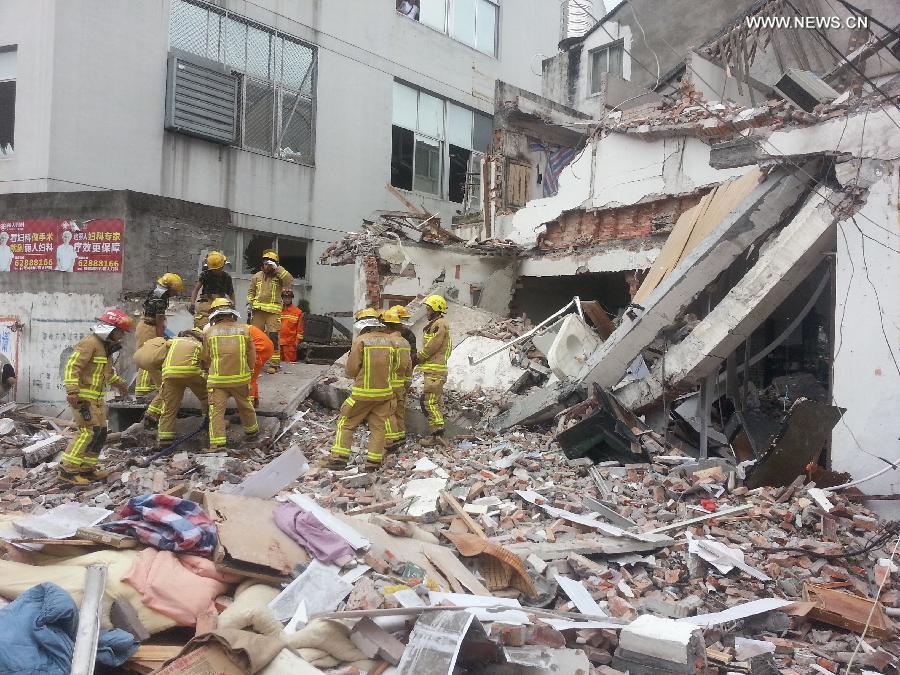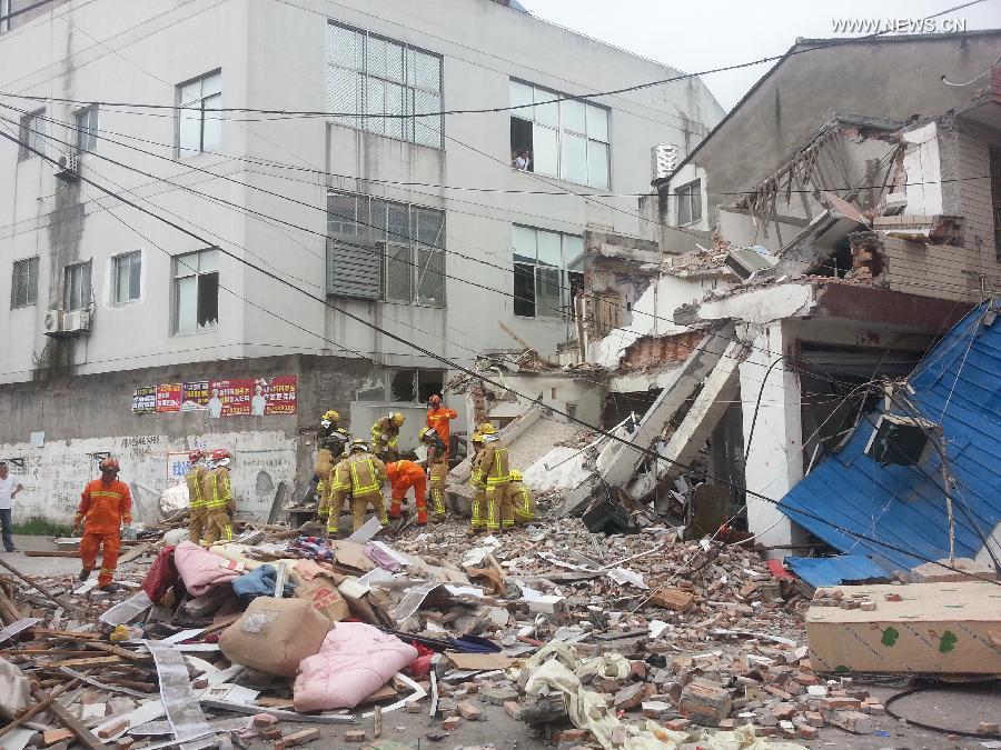 Firefighters work at the site of gas explosion in Pandong Village of Leqing City in Wenzhou, east China's Zhejiang province, Aug 11, 2014. A gas explosion toppled a two-story residential building at 11:30 am on Monday, causing one dead and other six injured. A child is still trapped in the collapsed building, according to local residents. Rescue work is still under way. (Xinhua)