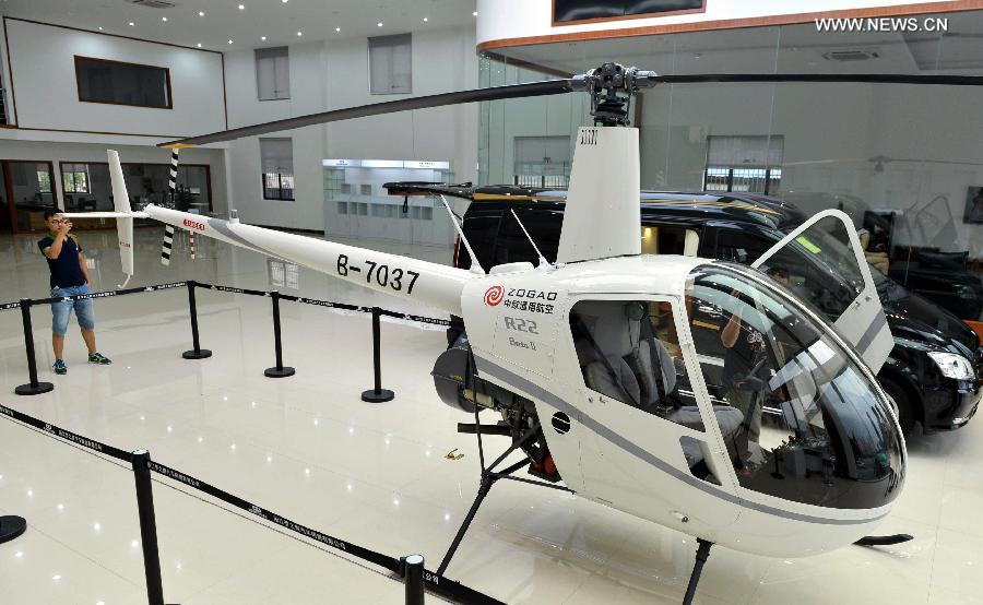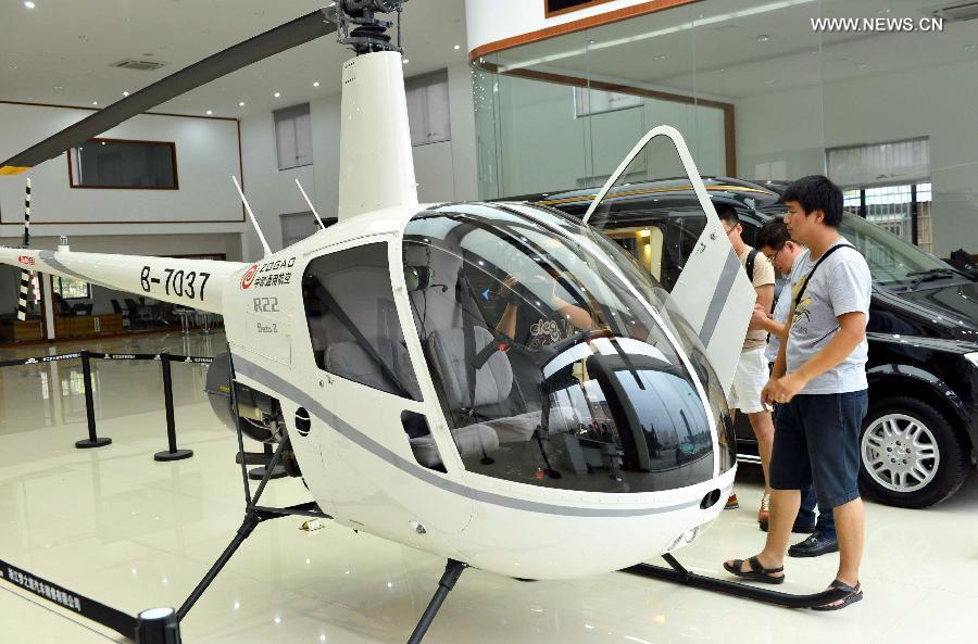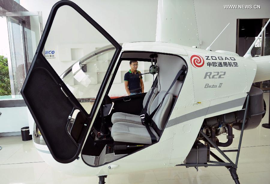 A man looks at a helicopter in the store of helicopter manufacturer ZOGAO in Hangzhou, capital of east China's Zhejiang Province. The store, first of its kind in Hangzhou, store opens recently. (Xinhua/Long Wei)