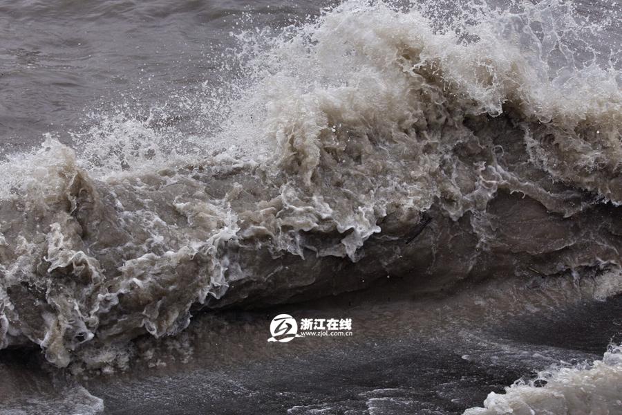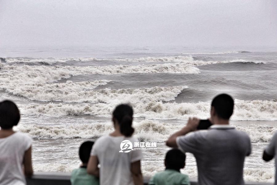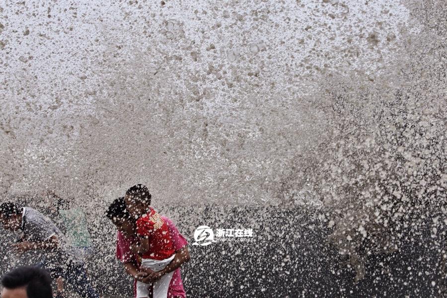 Tide watchers flee when huge tidal waves of Qiantang River caused by the "supermoon" surges through the dike in Hangzhou City, capital of Zhejiang province, on Aug 11. [Photo/zjol.com.cn]