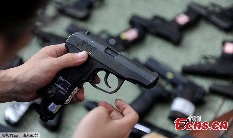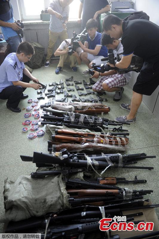 Police officers of Shenyang, Liaoning province show imitation guns seized from a local military fan on August 11, 2014. Local police says the collector surnamed Zhang is a 36-year-old woman. A total of 108 replica guns and 8,746 bullets have been seized from a warehouse of Zhang. Dozens of guns of those being confiscated are capable of causing injury, police said. [Photo/ CFP]