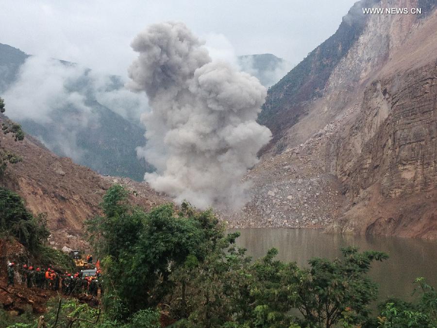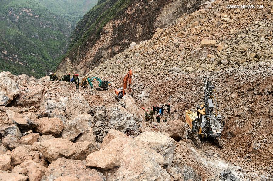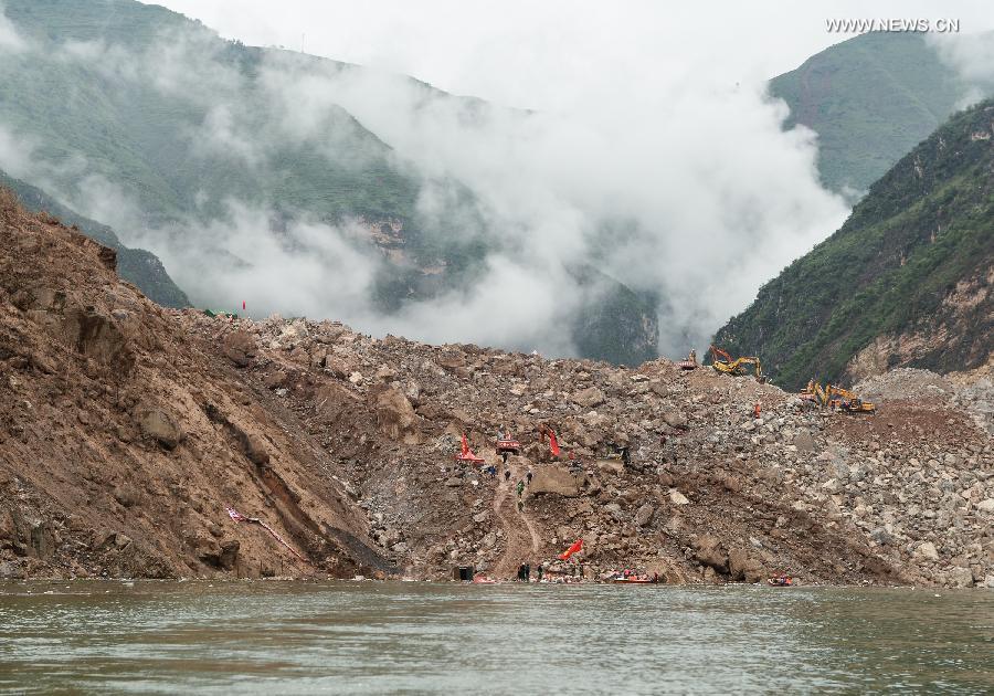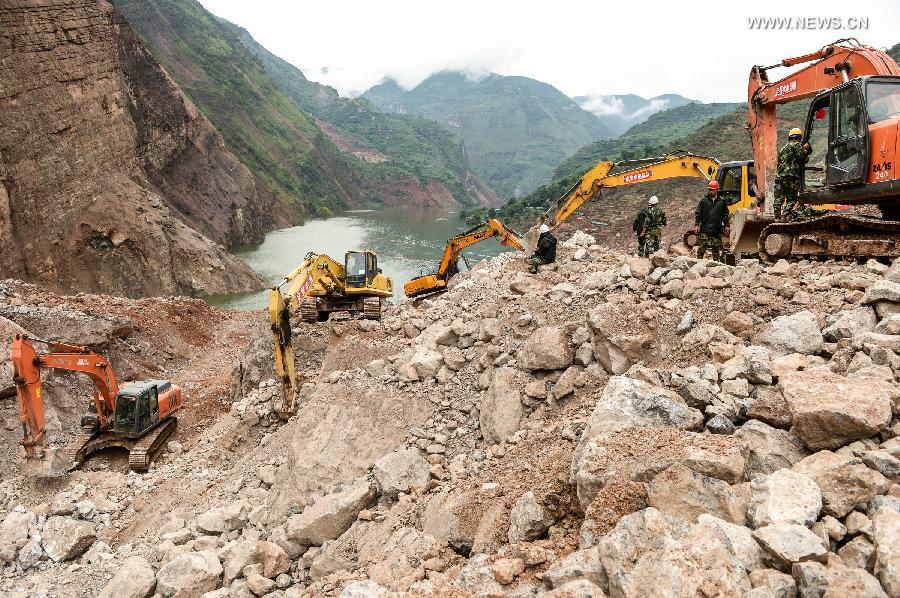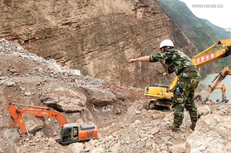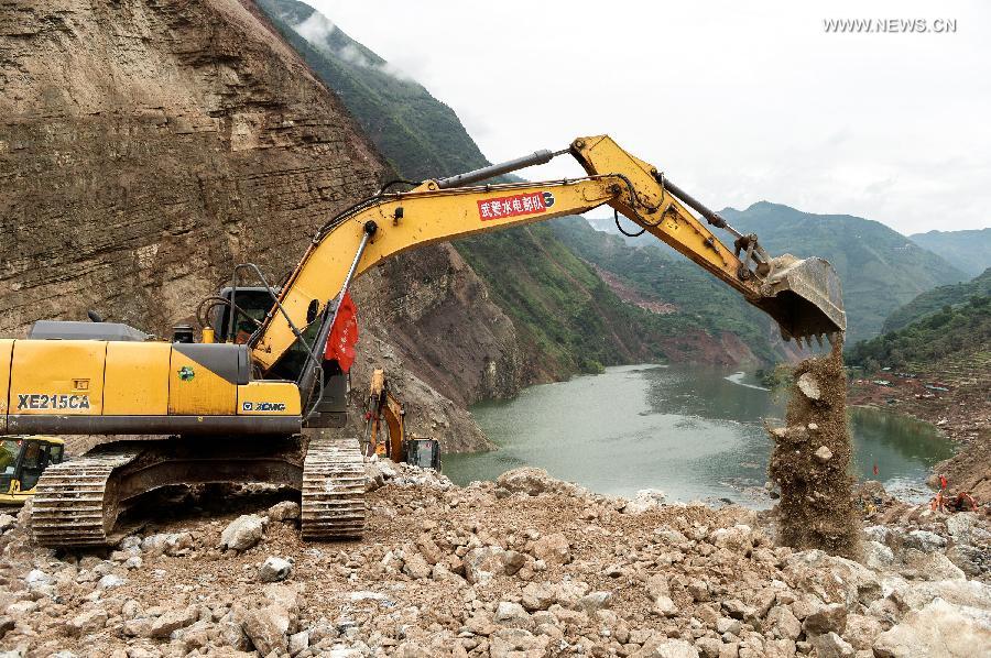 Soldiers try to make a sluice channel from the barrier lake, which is formed when landslides blocked the Niulan River, in Ludian County, southwest China's Yunnan Province, Aug. 12, 2014. The water level of the barrier lake is rising alarmingly, thus posing a risk for local residents. (Xinhua/Li He)