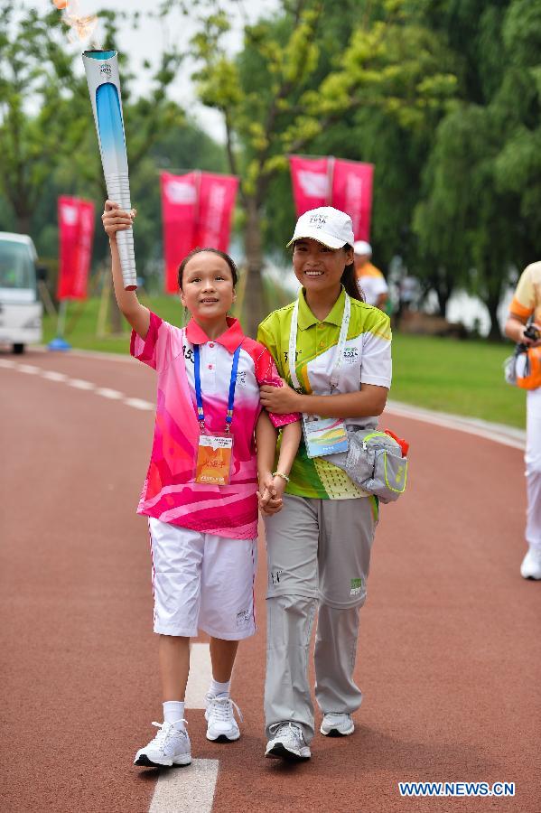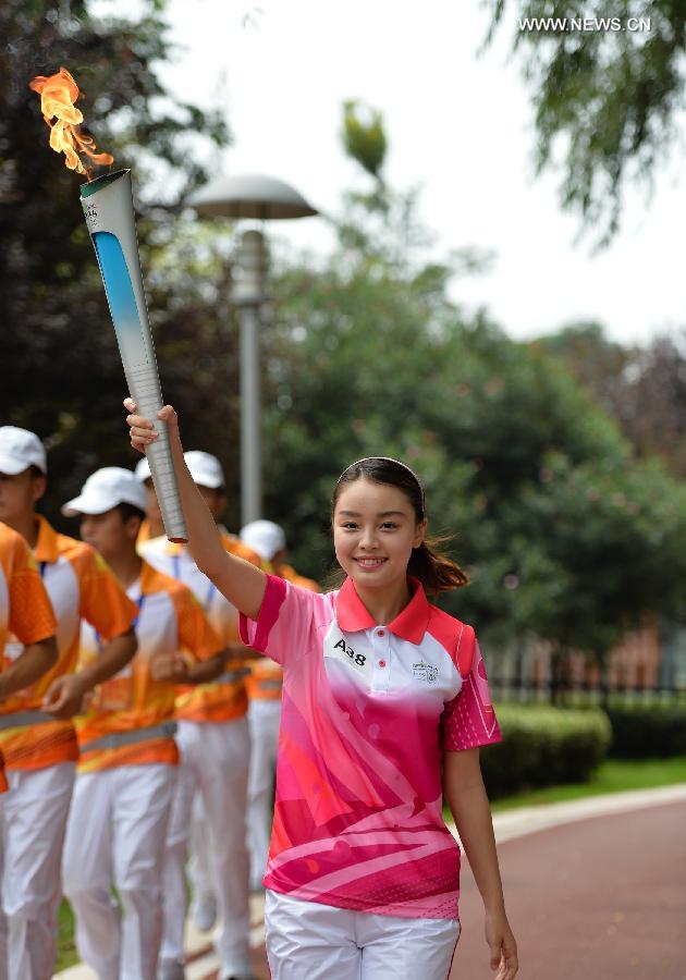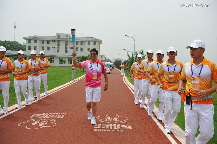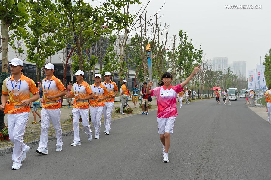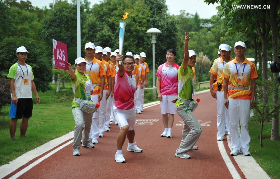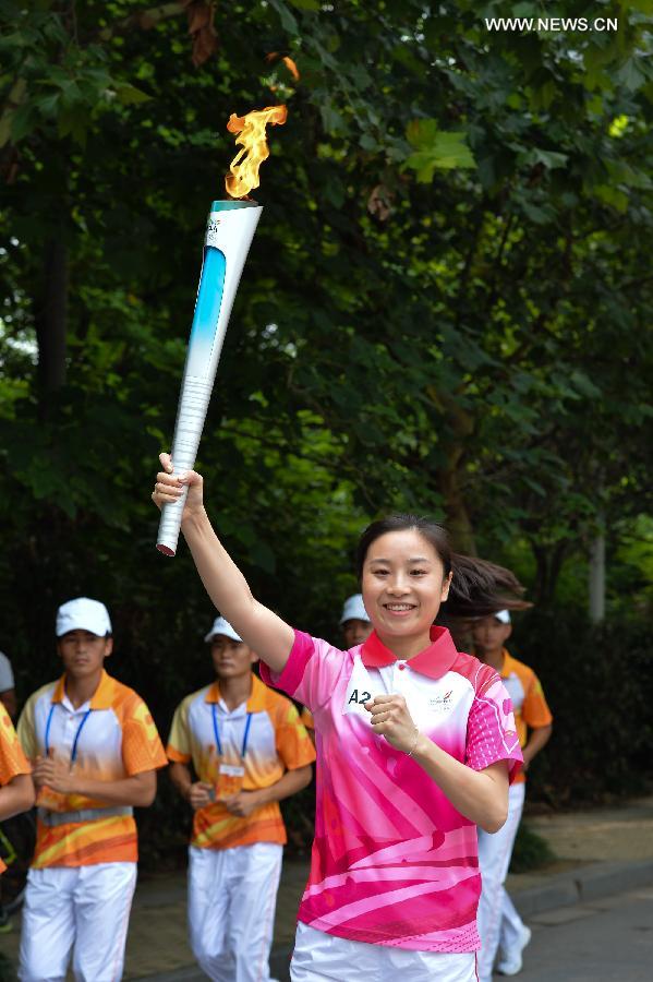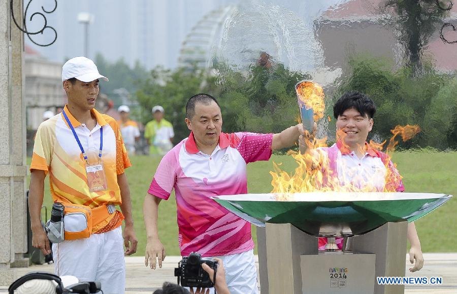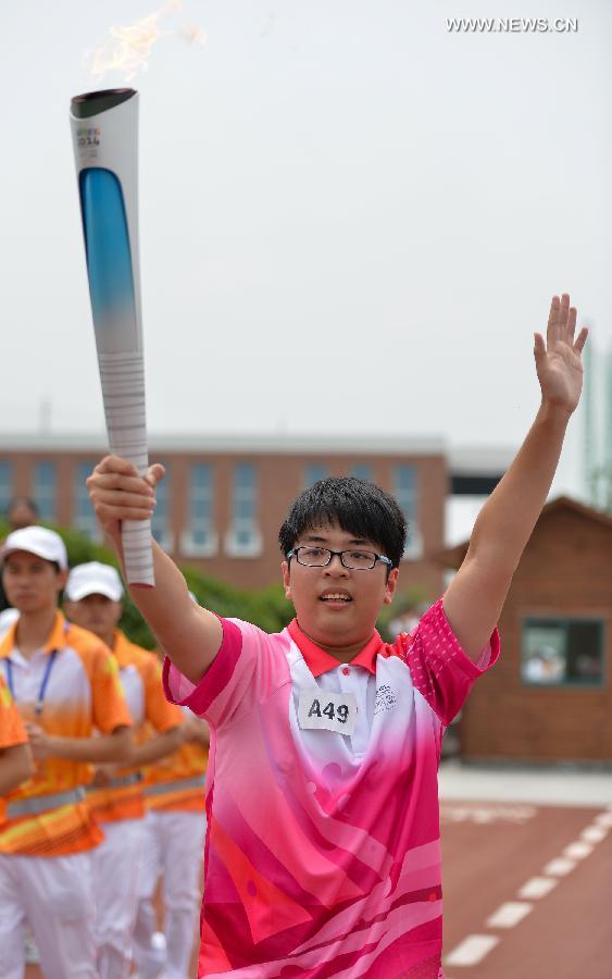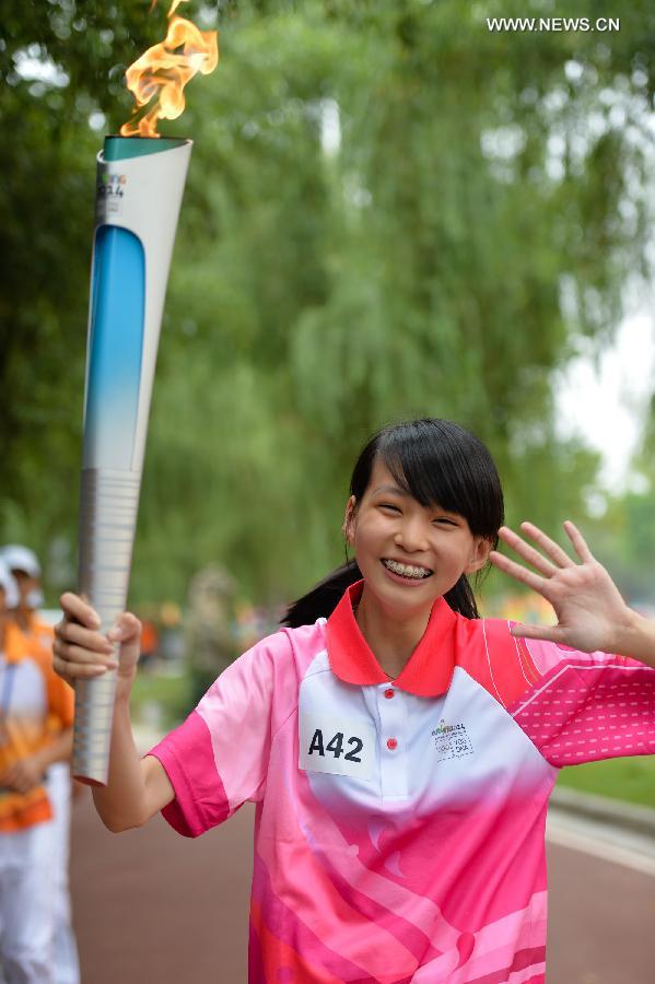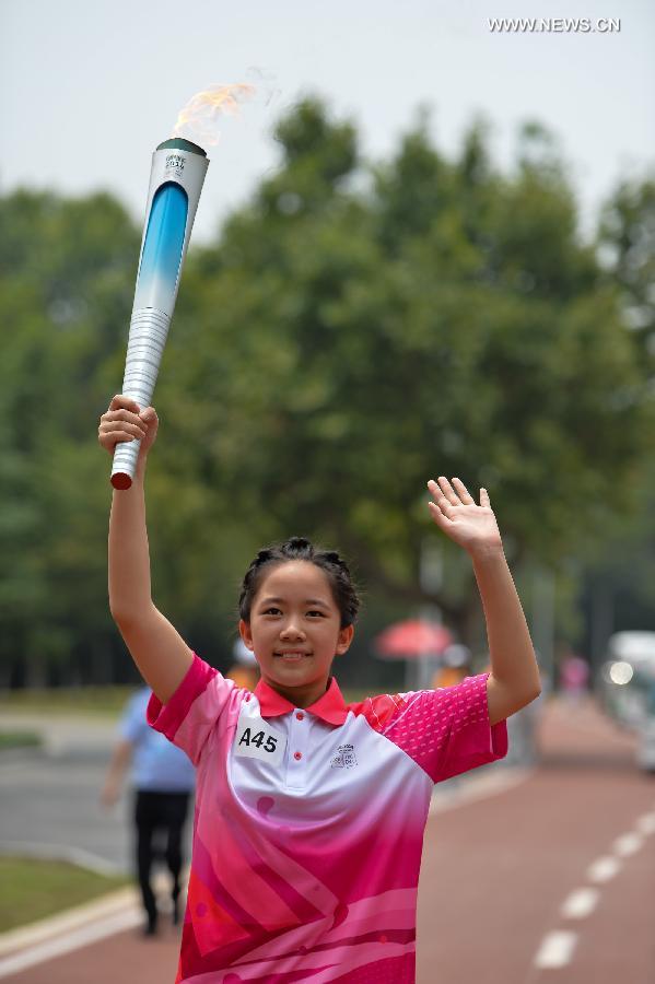 Torch bearer Wang Wei holds the flame during the torch relay of Nanjing 2014 Youth Olympic Games in Nanjing, capital of east China's Jiangsu Province, on Aug.12, 2014. Nanjing 2014 Youth Olympic Games will be held from August 16 to 28.(Xinhua/Li Xiang)