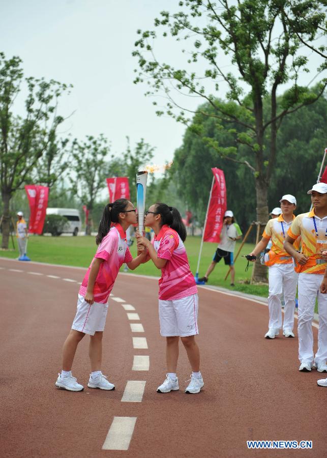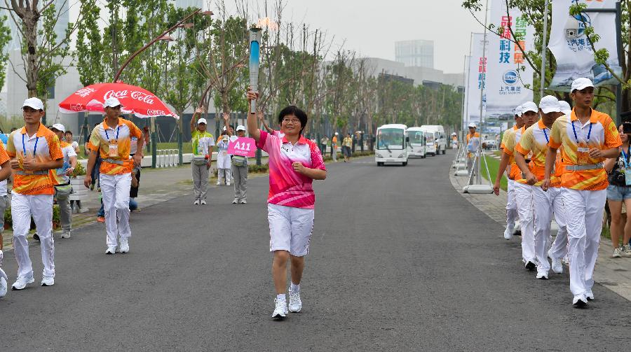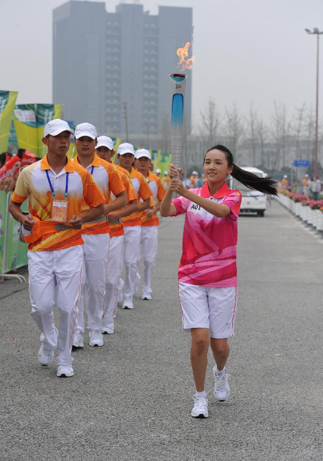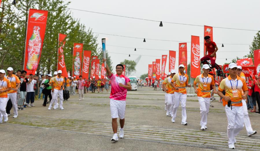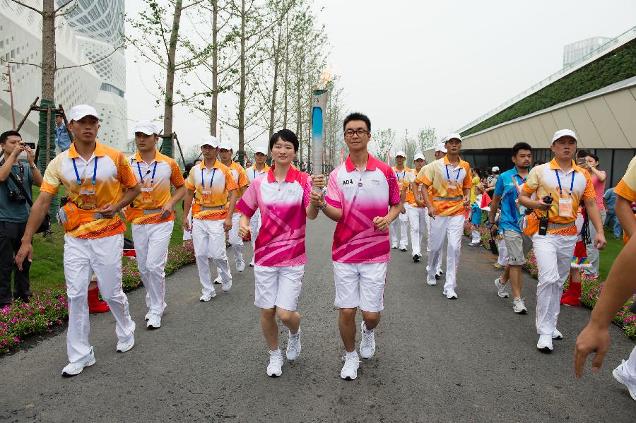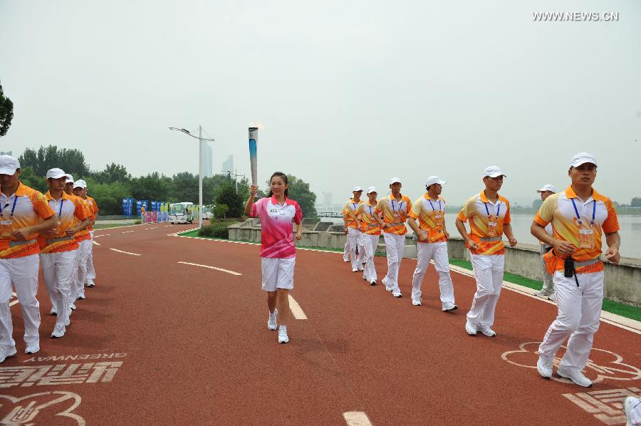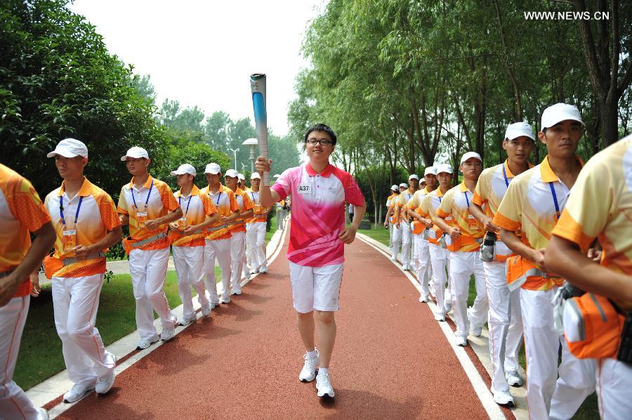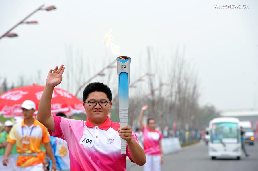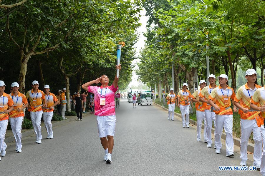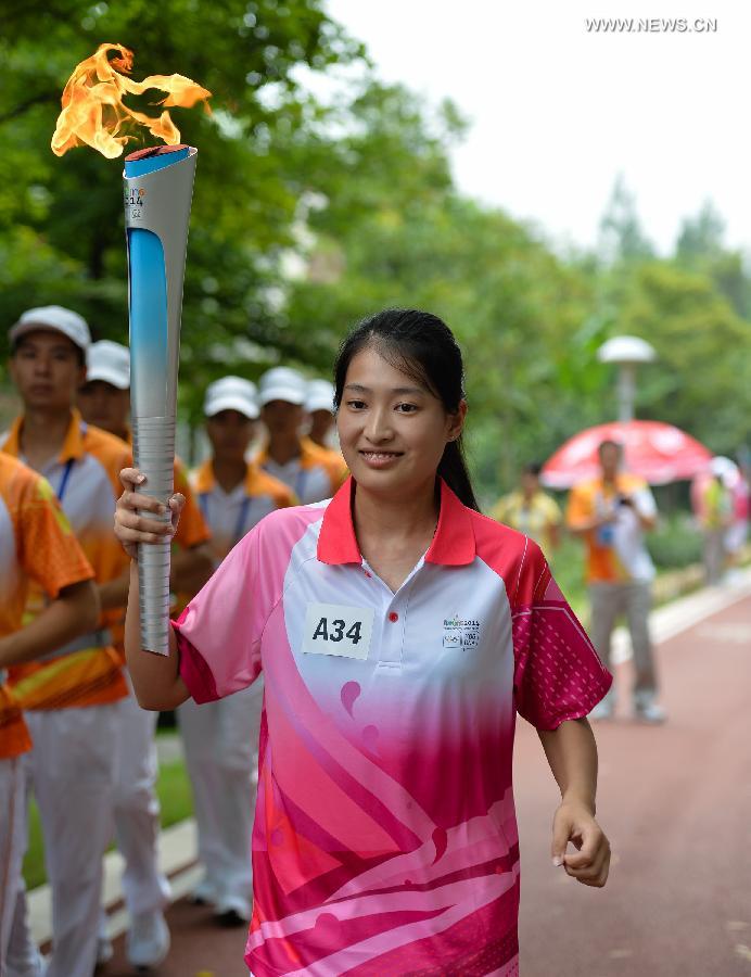 Torch bearer Wang Wei holds the flame during the torch relay of Nanjing 2014 Youth Olympic Games in Nanjing, capital of east China's Jiangsu Province, on Aug.12, 2014. Nanjing 2014 Youth Olympic Games will be held from August 16 to 28.(Xinhua/Li Xiang)