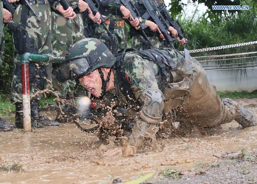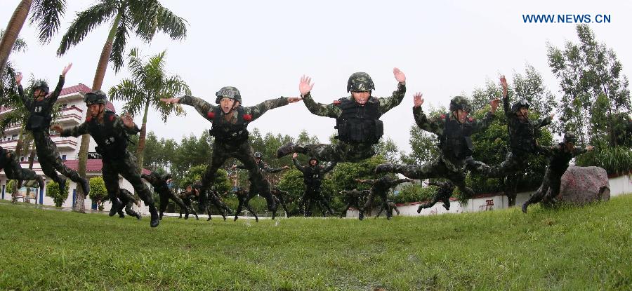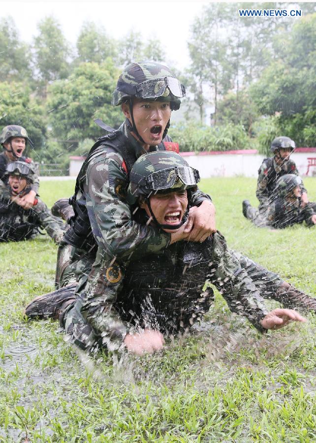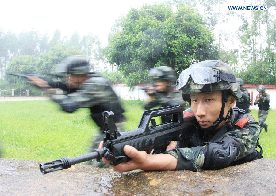 Special combat soldiers of Guangxi Armed Police Corps take part in an anti-terrorism drill in Wuzhou, south China's Guangxi Zhuang Autonomous Region, Aug 12, 2014. (Xinhua/Lu Jiating)