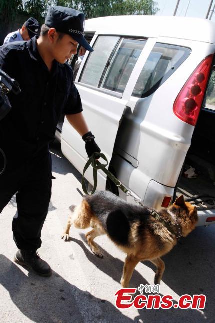 Armed guards and police dog are at a border checkpoint of Beijing on August 12, 2014. Beijing has stepped up security measures to inspect vehicles and people coming into the city this month for the ongoing Third Senior Officials' Meeting of the Asia Pacific Economic Cooperation (APEC). [Photo: China News Service / Ren Haixia]