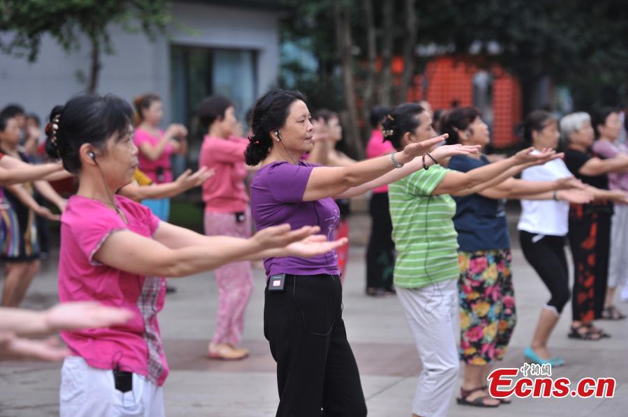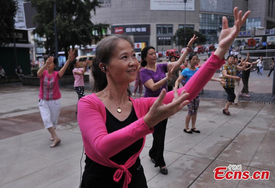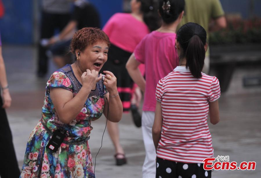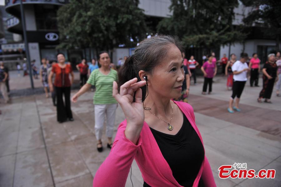 A middle-aged woman enjoys her time of dancing with music in a wireless headset on a square in Chongqing municipality on August 13, 2014. To control sound of square dance – a favorite of Chinese damas- a resident community of the city bought remote headphones and dispatched them to a team of dancers. [Photo/ Chen Chao]