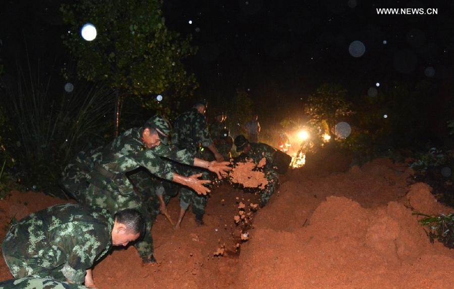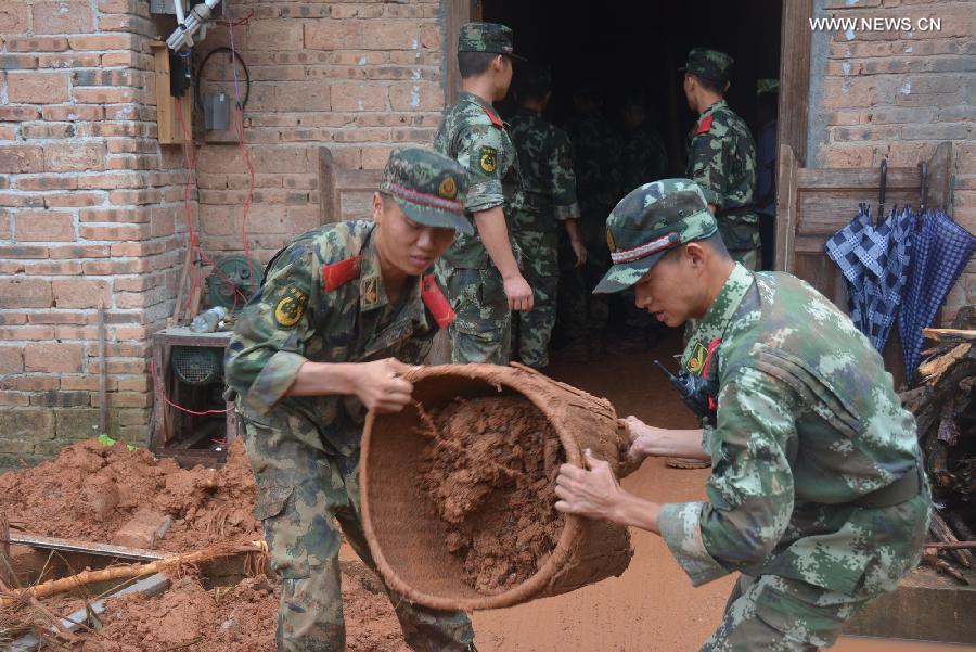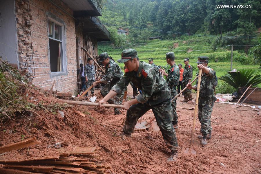 Photo taken on Aug. 13, 2014 shows a destroyed house at Fengcheng Village of Zuo'an Township in Suichuan County, east China's Jiangxi Province, Aug. 13, 2014. Five people were killed after landslides triggered by downpours in the county on Wednesday. (Xinhua/Li Zhongzhou)