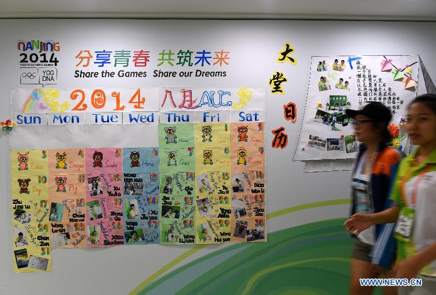 Volunteers of Nanjing 2014 Youth Olympic Games put up their cartoon photos on the wall of the Main Media Centre in Nanjing, capital of east China's Jiangsu province, on Aug. 13, 2014. (Xinhua/Yan Yan)