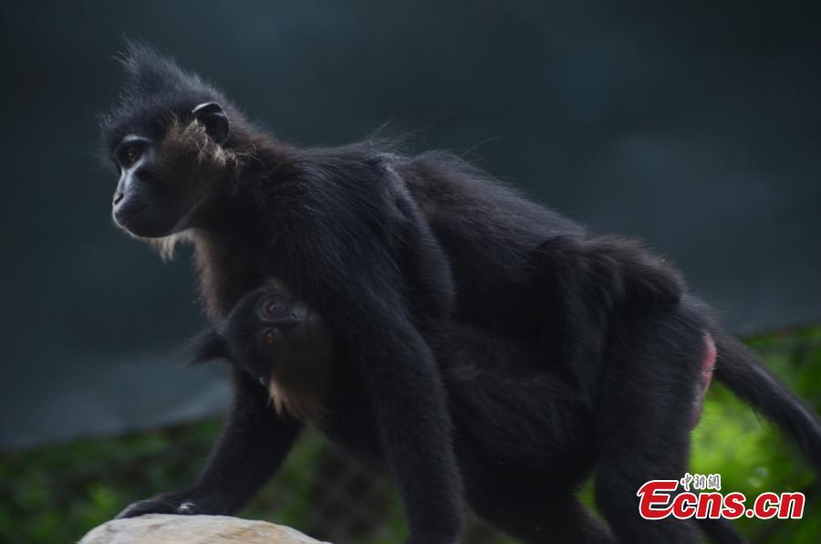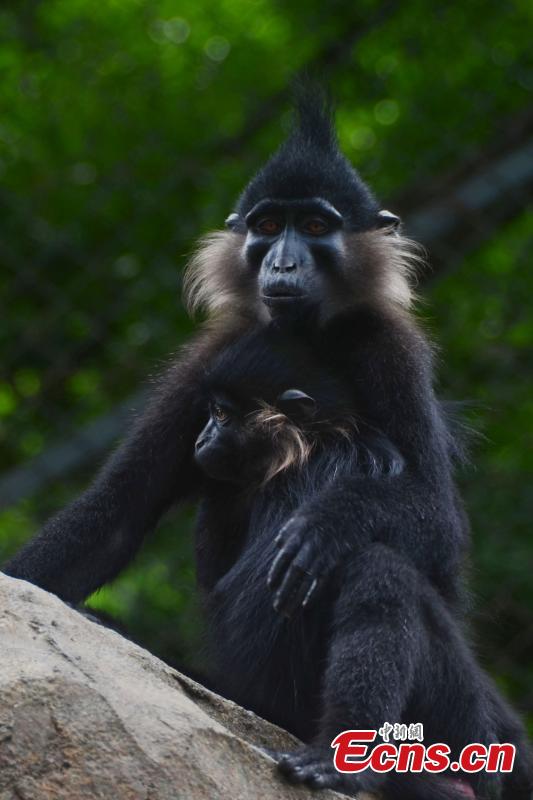 An 11-year-old black crested mangabey holds a 1-year-old mangabey monkey firmly in a safari park in Shenzhen, South China's Guangdong province, August 14, 2014. The female mangabey has adopted the young as its own child. (Photo: China News Service/Li Musheng)