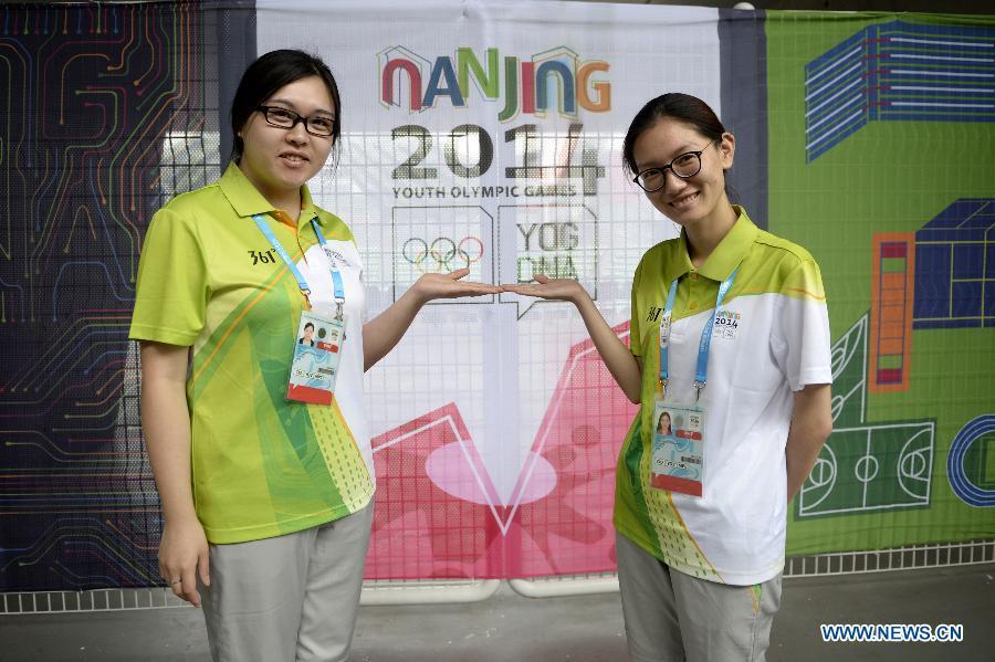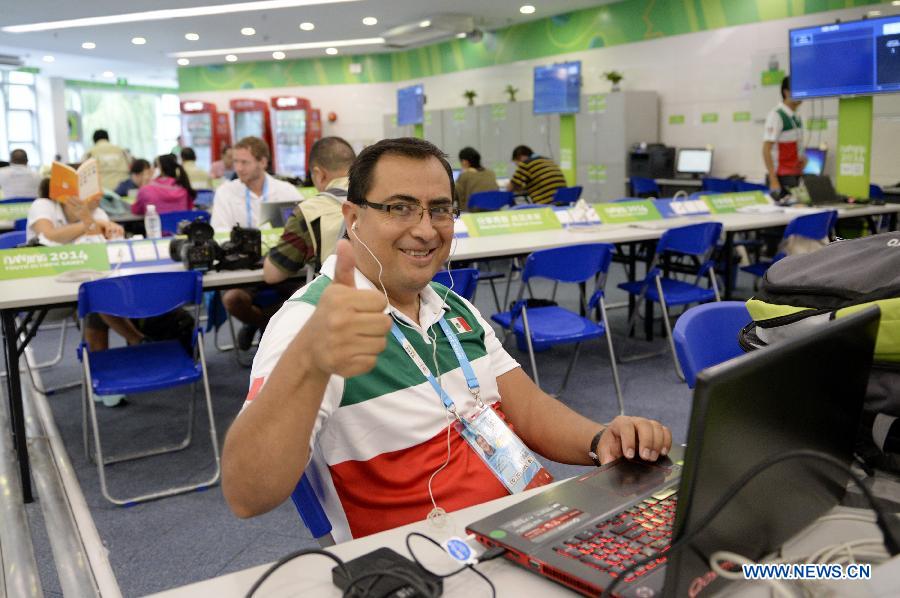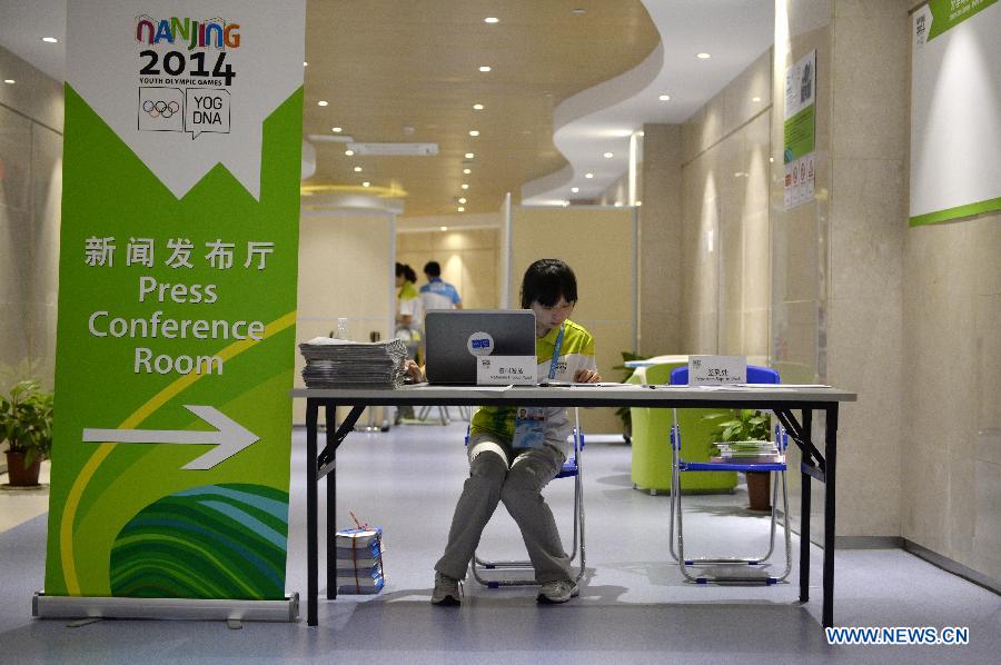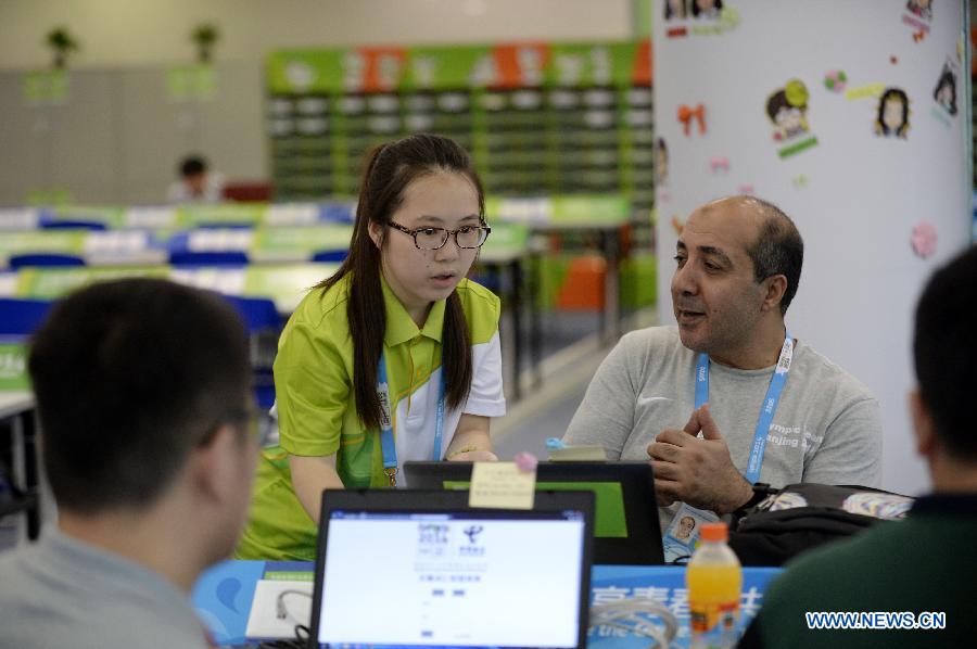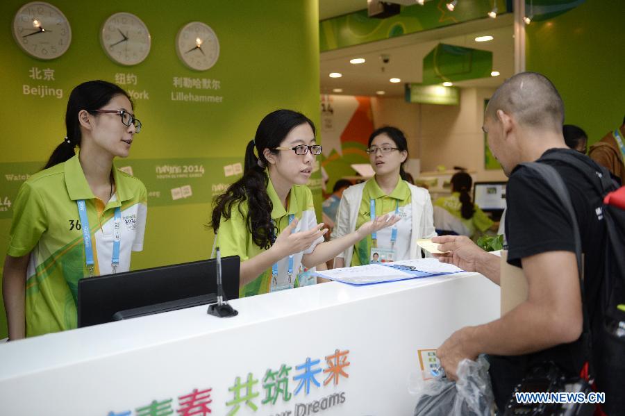 Volunteers of Nanjing 2014 Youth Olympic Games offer information to a journalist from Malaysia at Main Media Centre in Nanjing, capital of east China's Jiangsu province, on Aug 14, 2014. (Xinhua/Ju Huanzong)