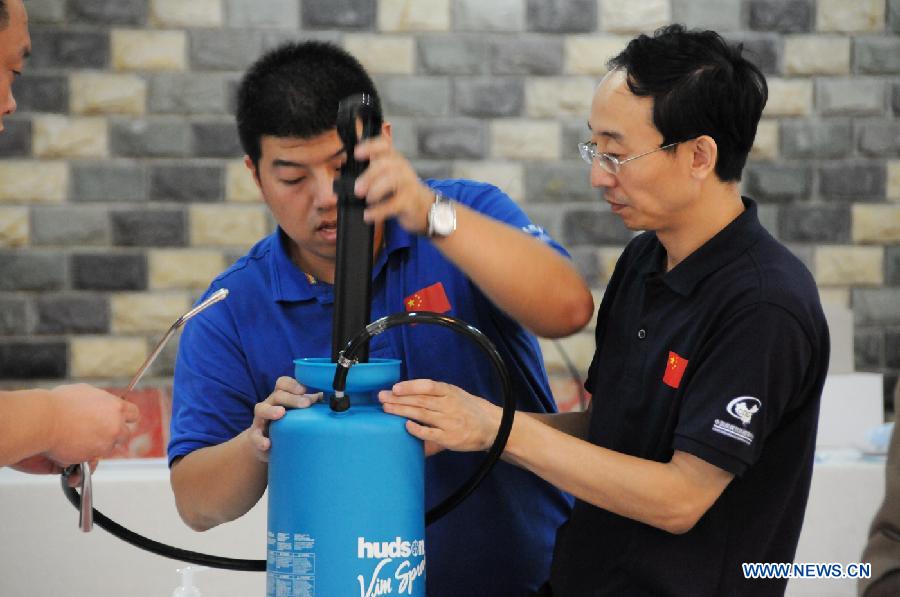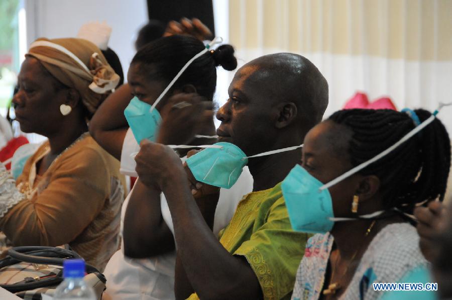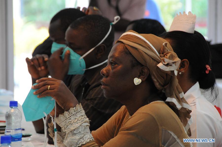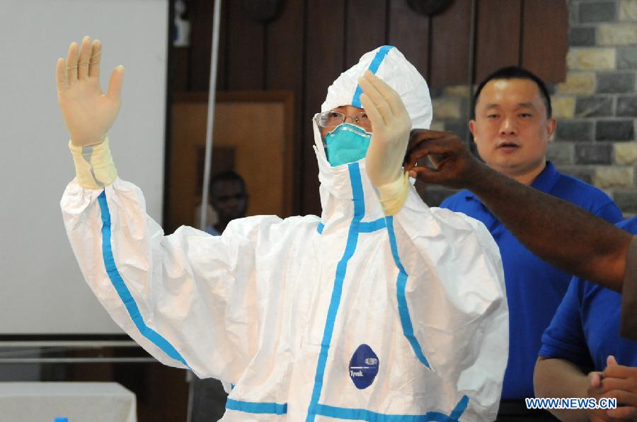 Members of Chinese medical expert team demonstrate during a training with Sierra Leone medical workers in Freetown, Sierra Leone, Aug. 14, 2014. China has sent three expert teams and medical supplies to Guinea, Liberia and Sierra Leone to assist in the prevention and control of the Ebola virus. (Xinhua/Lin Xiaowei)