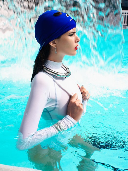 A model wearing a facekini poses for CR Fashion Book's fashion photo. The "facekini," a popular piece of swimming gear in China, has caught the attention of the international fashion world thanks to Carine Roitfeld, former chief editor of Vogue Paris. Roitfeld released a facekini-themed photo shoot titled "Masking in the Sun" in her magazine CR Fashion Book. Facekinis are widely seen in the coastal city of Qingdao, E China. Most wearers are middle-aged women who like swimming but don't want to their skin to get dark.