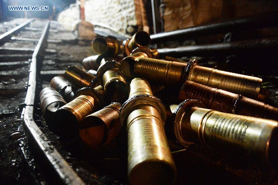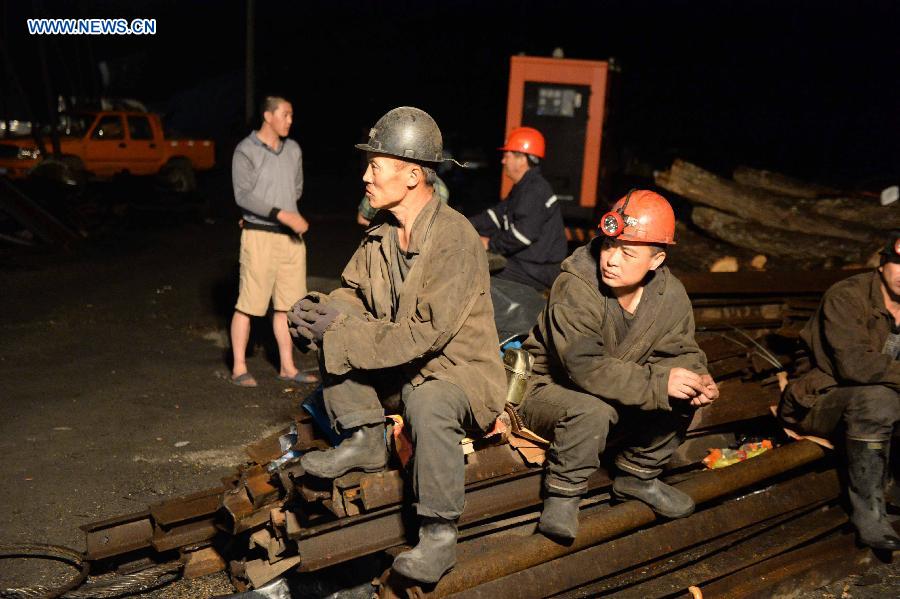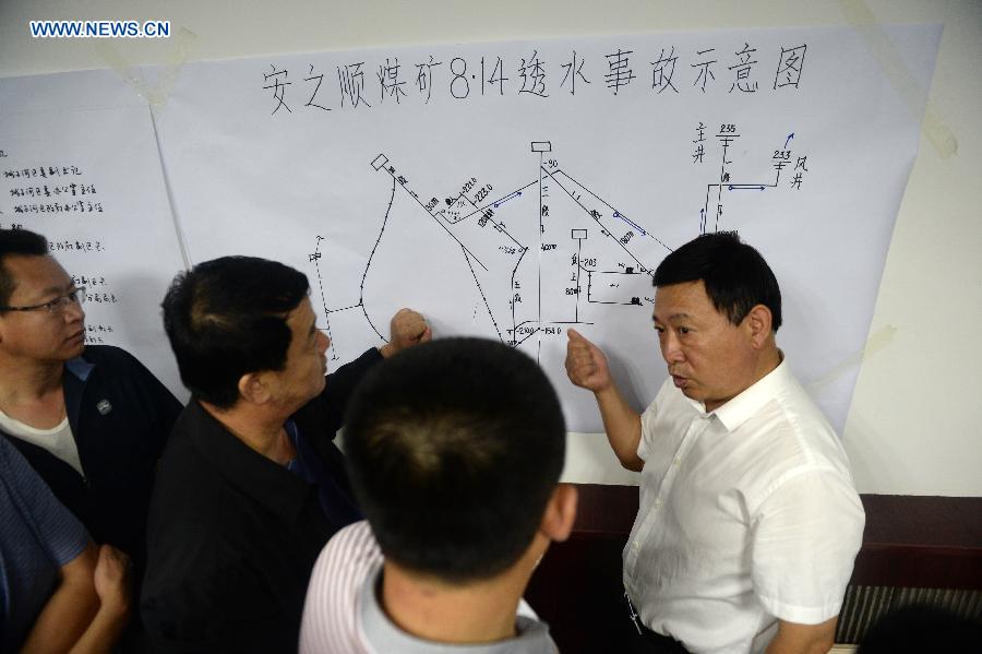 Rescuers try to put a pump into the flooded well of the Anzhishun Coal Mine at the Chengzihe district of Jixi,in northeast China's Heilongjiang Province, early on Aug. 15, 2014. Twenty-three people have been trapped after the coal mine was flooded in Jixi City on Aug. 14. (Xinhua/Wang Kai)