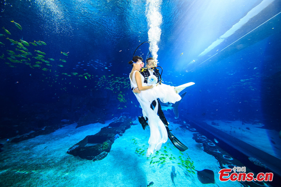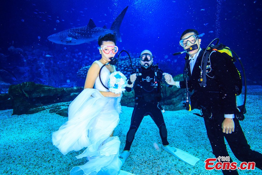 A couple attends an underwater wedding ceremony at the whale sharks' aquarium of Chimelong Ocean Kingdom in Zhuhai city of south China's Guangdong province on Aug. 14, 2014. The newly-weds, from Guangzhou, are both diving enthusiasts with professional certificates. [Photo: China News Service / Mo Wei]