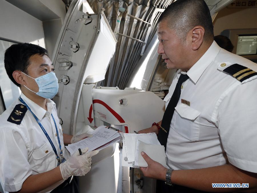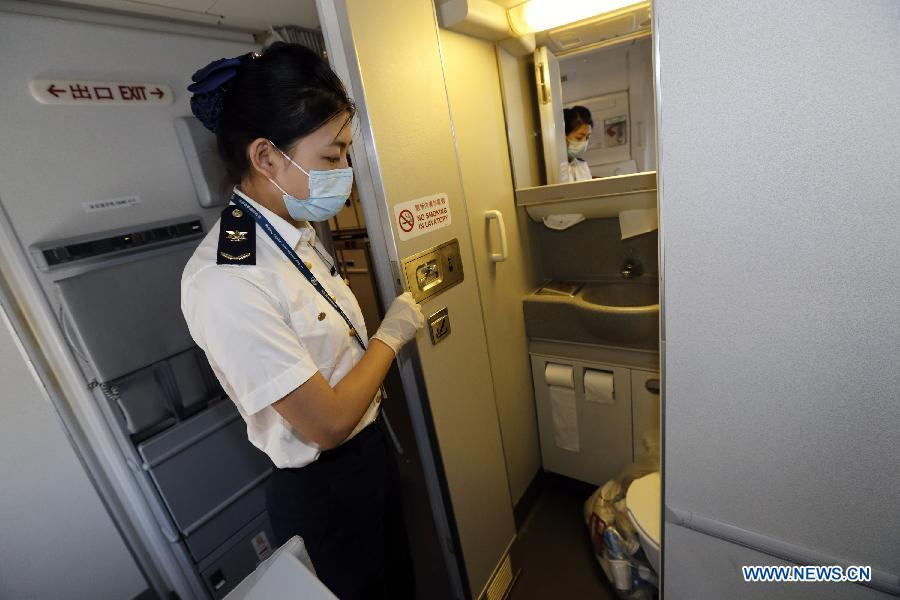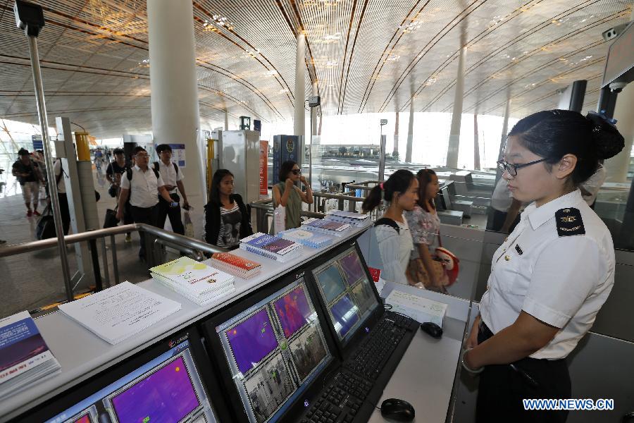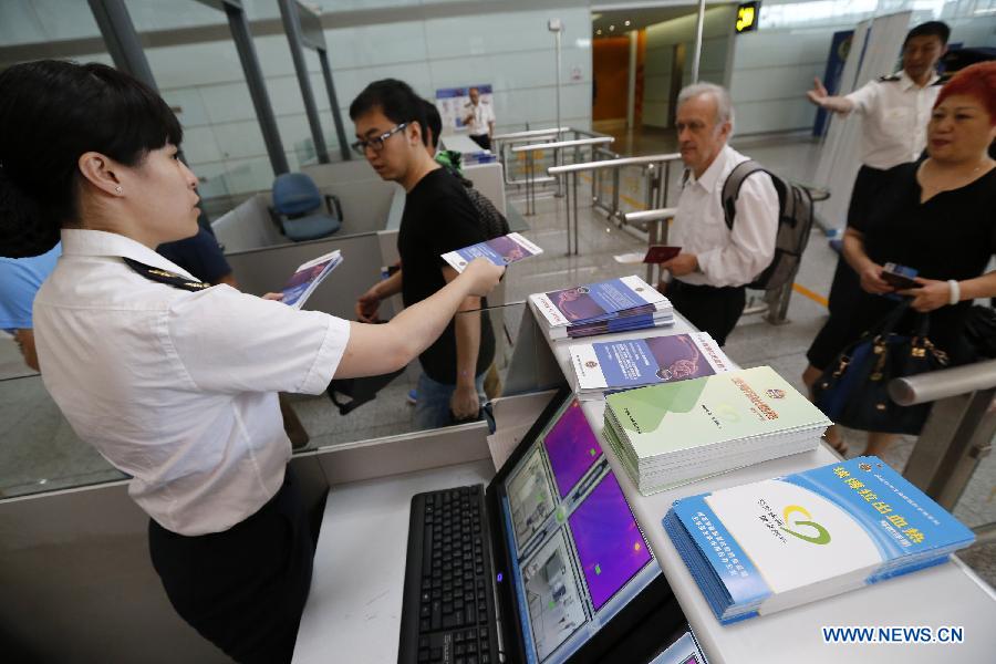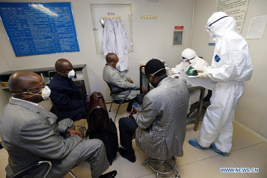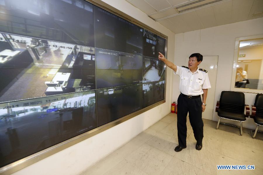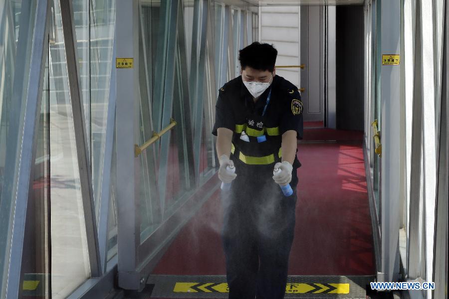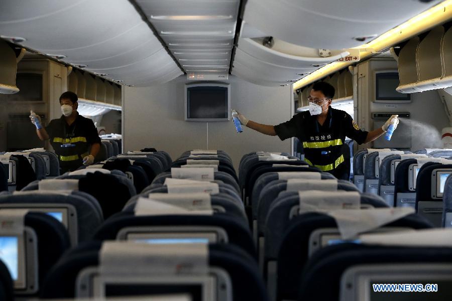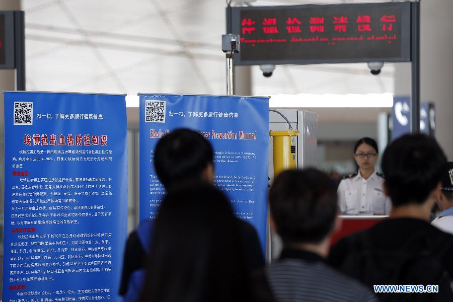 A quarantine staff member sterilizes a cargo from Frankfurt, a possible transfer stop for travelers who have been to western Africa, at the Beijing Capital International Airport in Beijing, capital of China, Aug. 14, 2014. To prevent the deadly Ebola virus from entering China, China's quarantine authority implements stricter inspections on inbound flights from regions affected by Ebola and step up sanitary measures on incoming goods. (Xinhua/Shen Bohan)