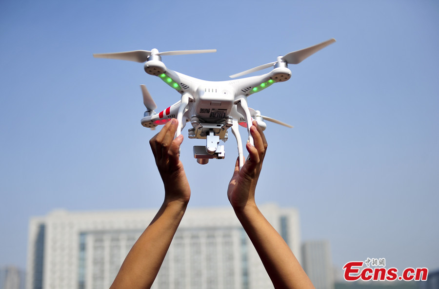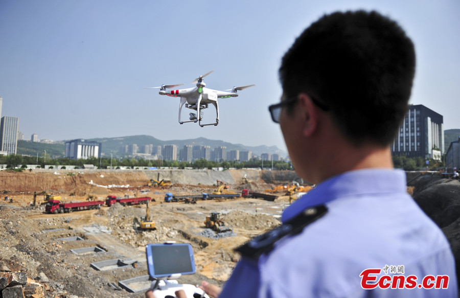 A staff member from the local environment protection bureau controls a micro aerial vehicle over a construction site at Lixia district in Jinan city of east China's Shandong province on Aug. 14, 2014. Micro aerial vehicles are used by the bureau to perform environment monitoring and pollution inspection missions. [Photo: China News Service / Zhang Yong]