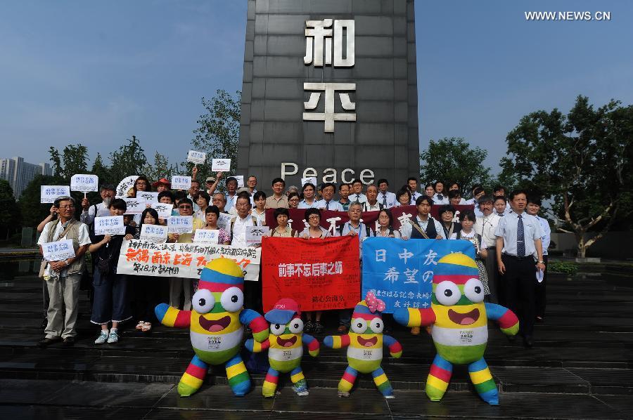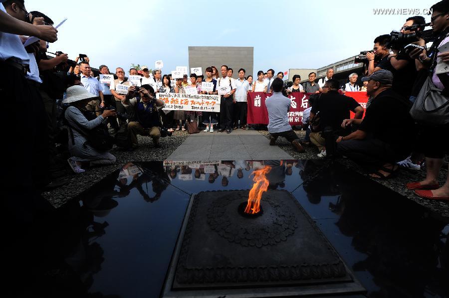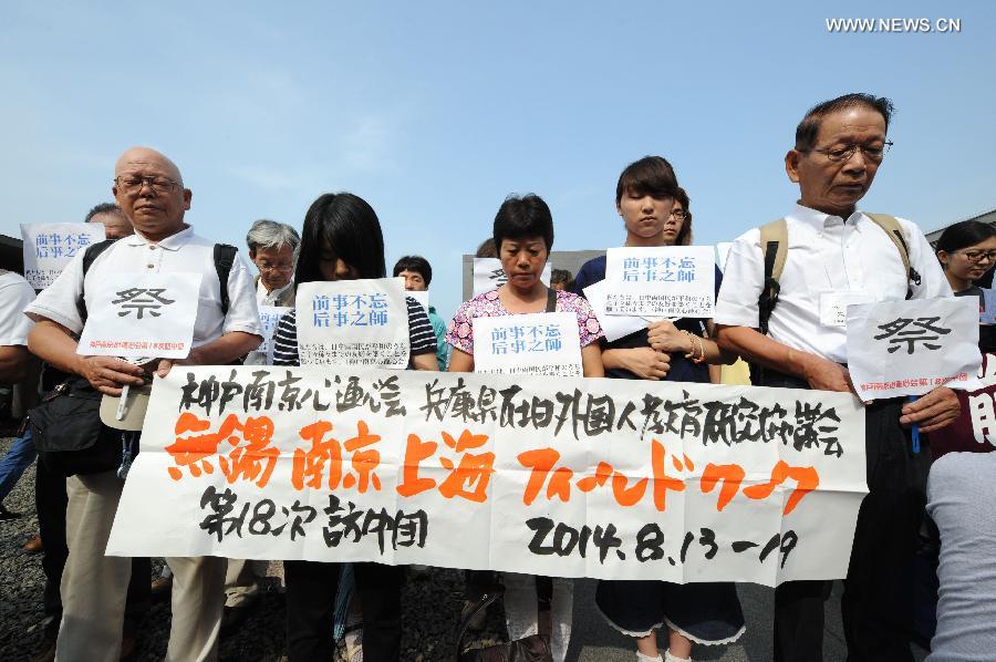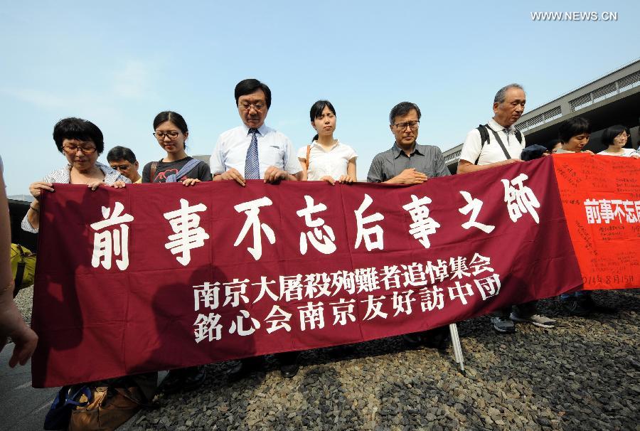 Zhu Chengshan (3rd L, front), curator of the Memorial Hall of the Victims in Nanjing Massacre by Japanese Invaders, mourns for victims of the Nanjing Massacre with Japanese delegates during an assembly in Nanjing, capital of east China's Jiangsu province, Aug 15, 2014. Friday marked the 69th anniversary of Japan's unconditional surrender at the end of world War II. (Xinhua/Sun Can)
