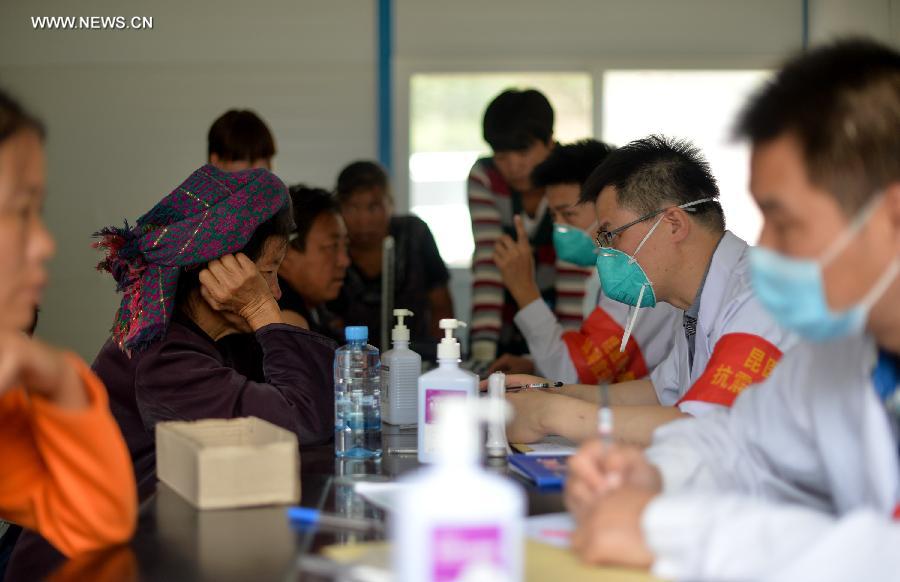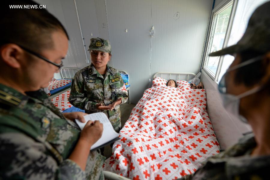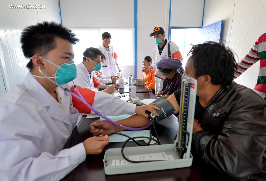 Doctors check patients in earthquake-hit Longtoushan Township of Ludian County, Aug 15, 2014. The first makeshift hospital after the 6.5-magnitude earthquake, which can accommodate 50 hospitalized patients and 150 clinic patients, was put into use here. (Xinhua/Bai Yu)
