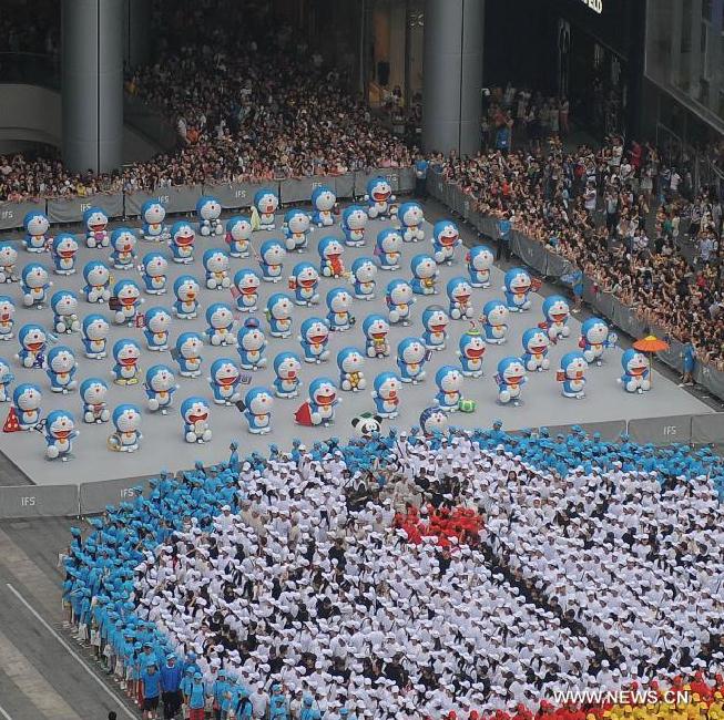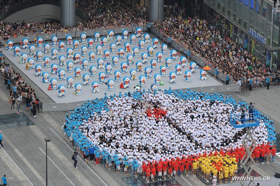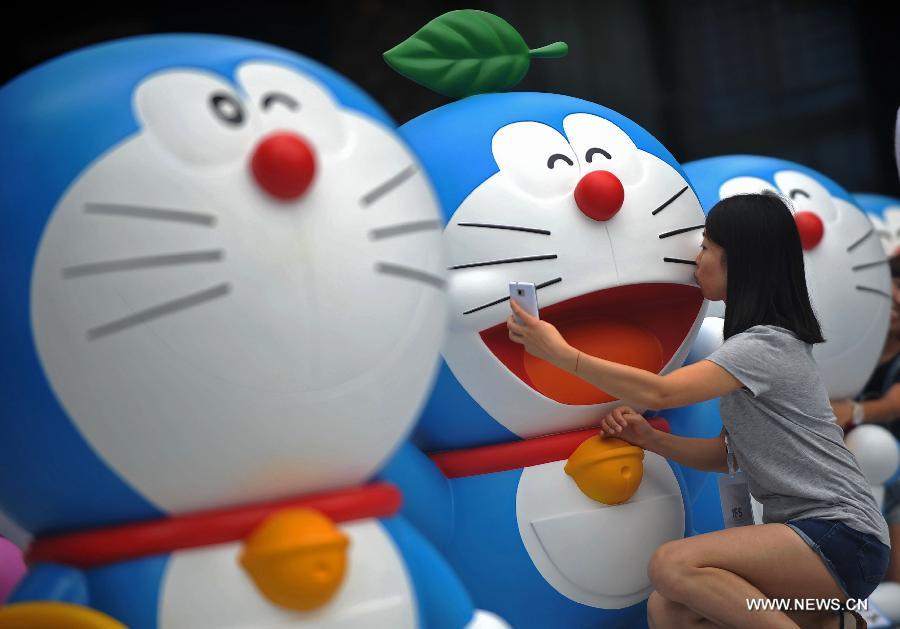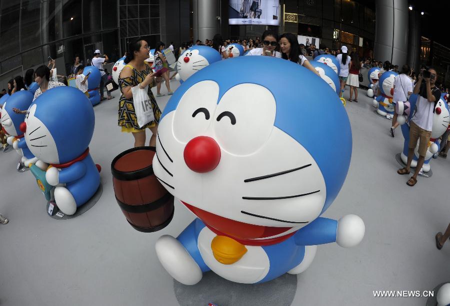A Doraemon exhibition is held in Chengdu, capital of southwest China's Sichuan Province, Aug. 16, 2014. The exhibition kicked off here on Saturday. A hundred and two life-size Doraemon figures, each of which bearing a distinct secret gadget, were displayed during the show. Doraemon, a fictional 22nd-century robotic cat, has been a popular anime character since its introduction by Japanese cartoonist Fujiko Fujio in 1969. (Xinhua/Xue Yubin)