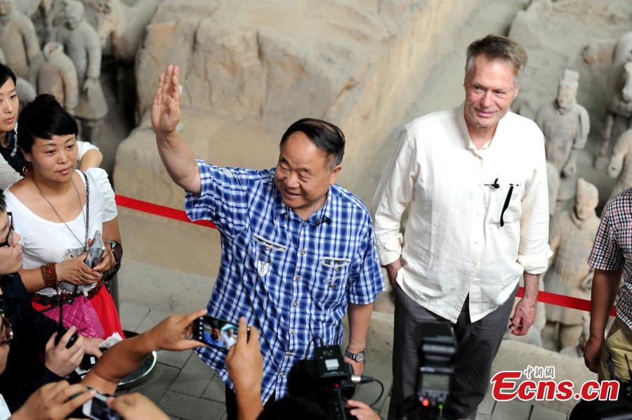 Chinese writer and winner of the 2012 Nobel Prize in Literature Mo Yan (L2) and French writer Jean-Marie Gustave Le Clezio (R1), who won the 2008 Nobel Prize in Literature, visit the Museum of Terra Cotta Warriors and Horses in Xi'an city of northwest China's Shaanxi province on Aug. 16 2014. [Photo: China News Service / Zhang Yuan]