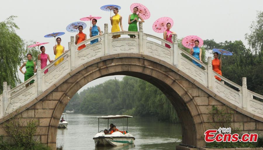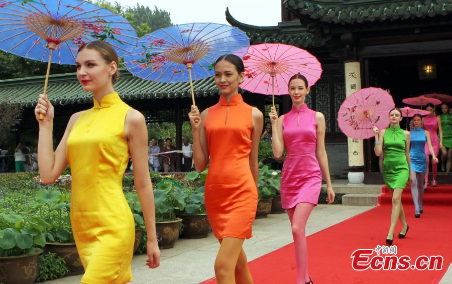 Participants of the 2014 New Silk Model Contest stage a qipao show at Slender West Lake scenic area in Yangzhou of east Chna's Jiangsu province on Aug. 16, 2014. [Photo: China News Service / Qian Xingqiang]