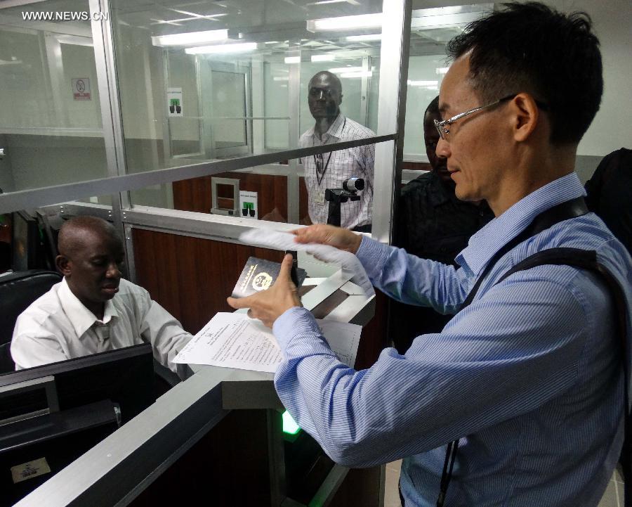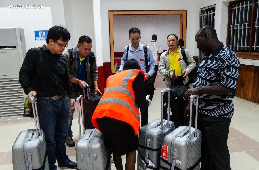 Chinese medical experts arrive at the Lungi International Airport in Freetown, capital of Sierra Leone, Aug 17, 2014. Three medical experts from central China's Hunan province arrived in the Ebola-affected Sierra Leone on Sunday. China has sent expert teams and medical supplies to Guinea, Liberia and Sierra Leone to assist in the prevention and control of the Ebola virus. (Xinhua)