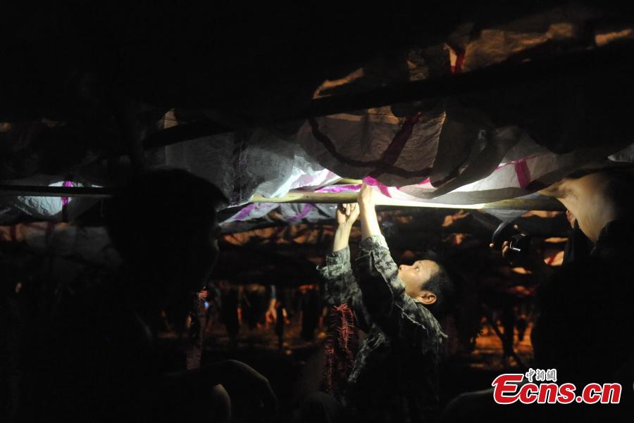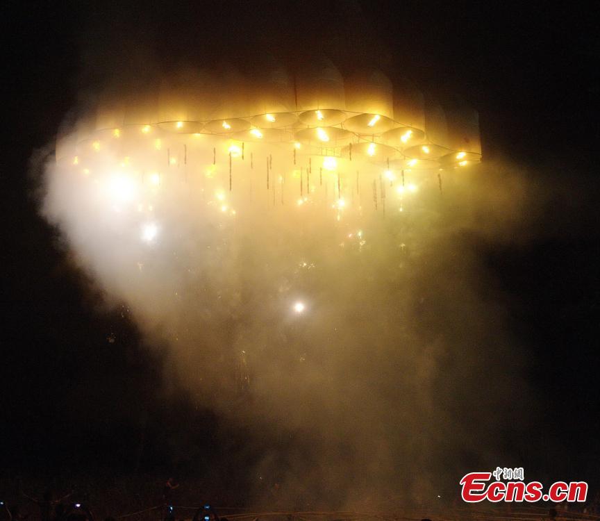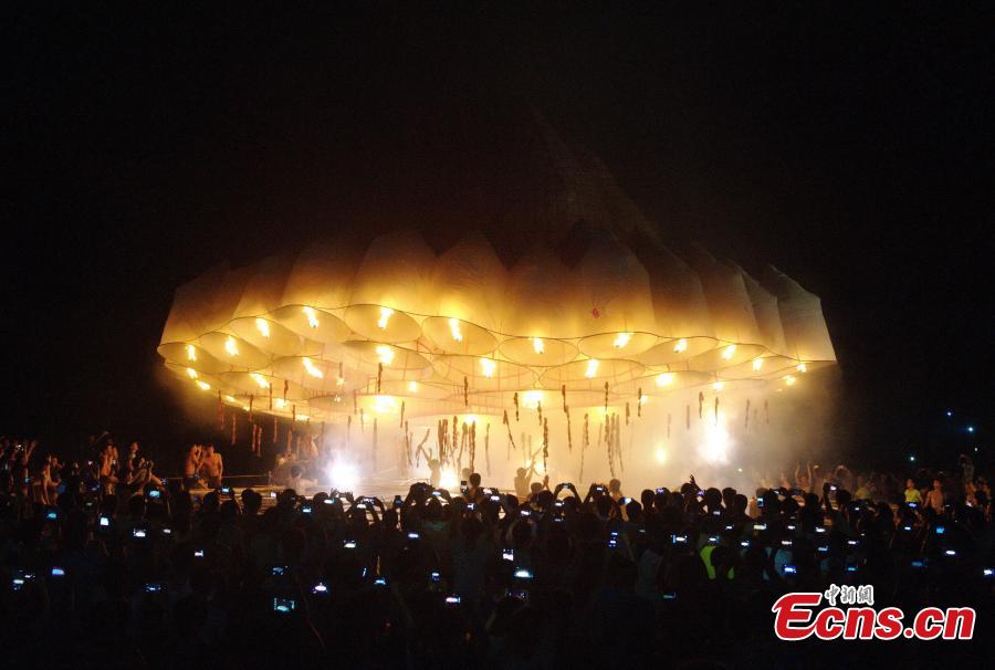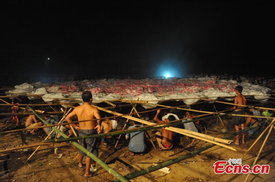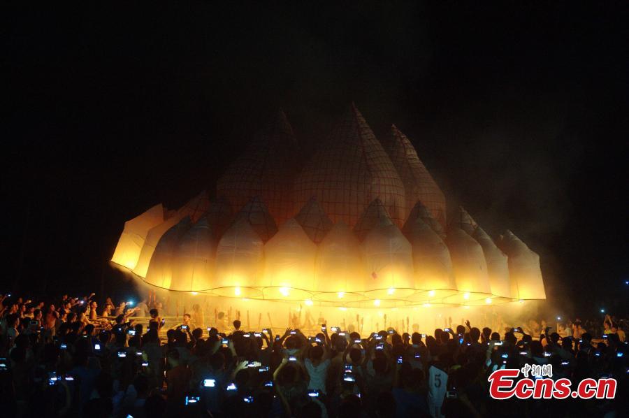 Villagers fly a giant sky lantern in Wanquan town of Qionghai city, south China's Hainan province on August 17, 2014. The giant sky lantern, about 40 meters in diameter, was composed of 62 small lanterns. It was formed by 60 workers in seven days. [Photo/ Meng Zhongde]
