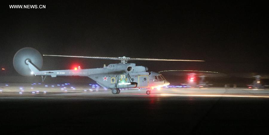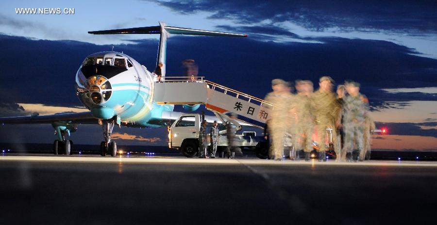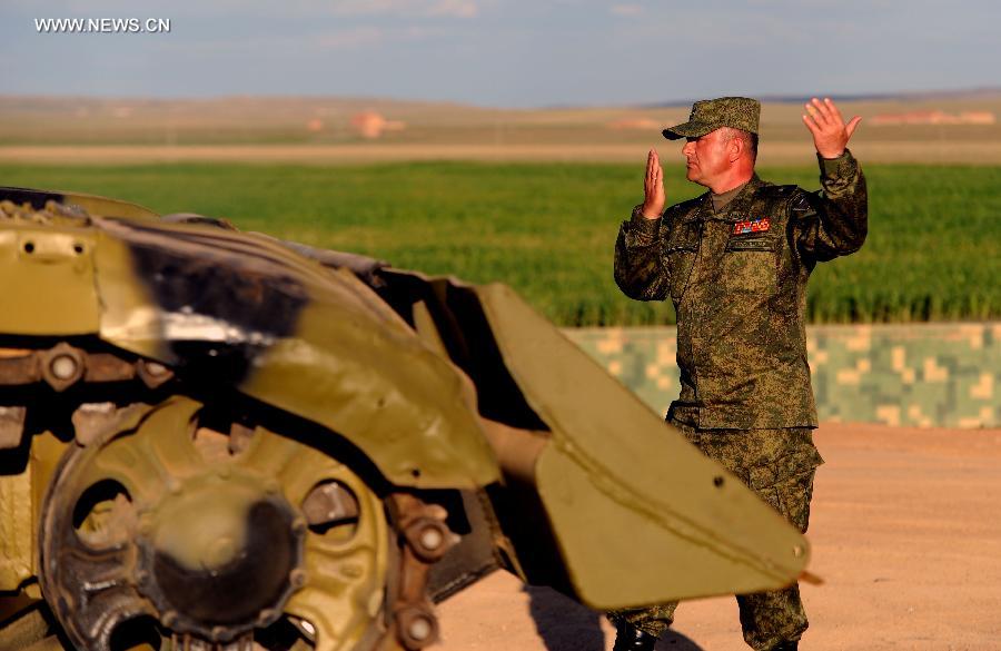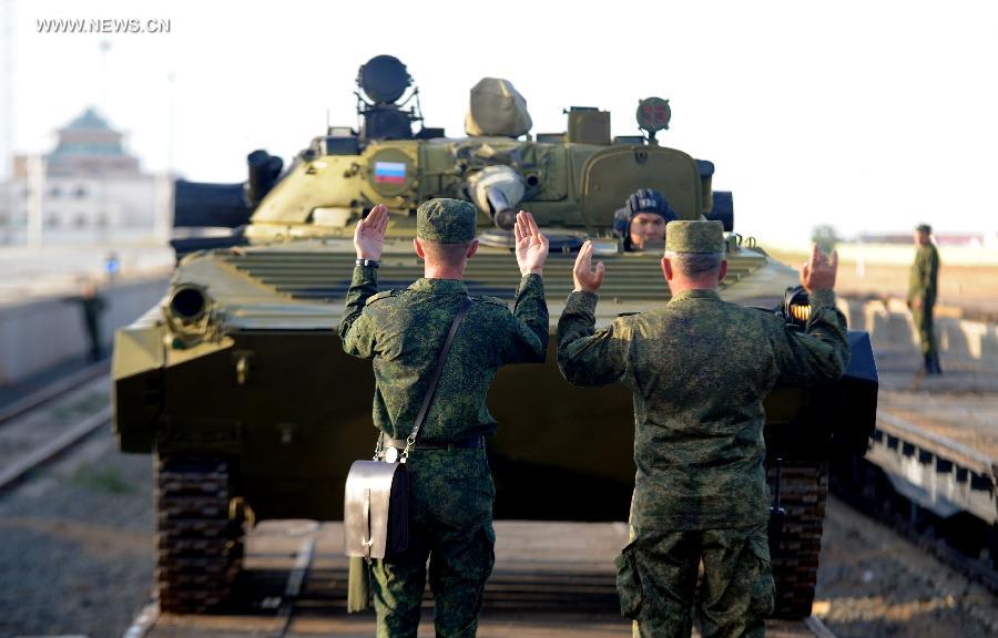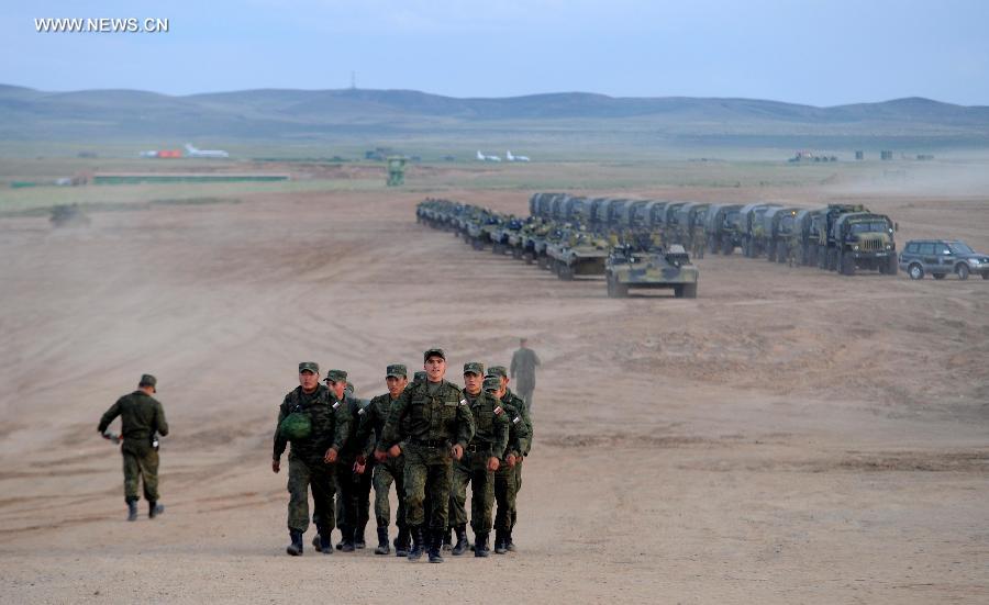 Russian soldiers arrive at the train station of the Zhurihe training base, north China's Inner Mongolia Autonomous Region, Aug. 16, 2014. A total of some 2,200 troops on Monday arrived at at the Zhurihe training base, where "Peace Mission-2014," a drill under the Shanghai Cooperation Organization (SCO) framework, will run from Aug. 24-29. The drill, which will involve over 7,000 personnel from China, Russia, Kazakhstan, Kyrgyzstan and Tajikistan, is expected to hone multilateral decision-making, sharpen joint anti-terror efforts and boost intelligence sharing to ensure regional peace and stability. (Xinhua/Zhang Ling)