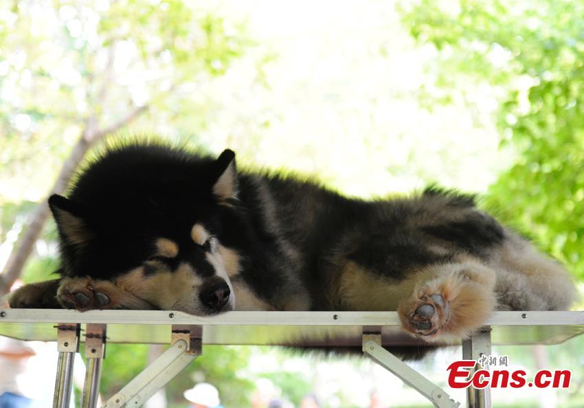 A dog is seen at the 13th Changchun International Agricultural Products Trade Fair in Changchun city of northeast China's Jilin province on Aug. 18, 2014. [Photo/Zhang Yao]