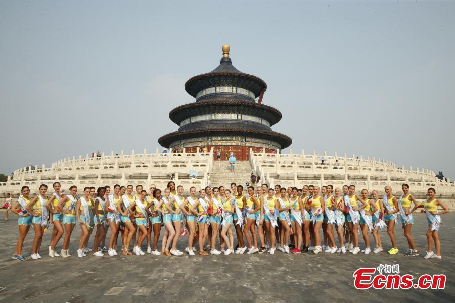 Contestants of 2014 OMC World Bikini Model Contest Global Final pose for a photo at the Great Wall in Beijing on Aug. 18, 2014. A total of 48 bikini models from 46 countries visited the Great Wall and the Temple of Heaven on Monday. [Photo: China News Service / Li Tao]