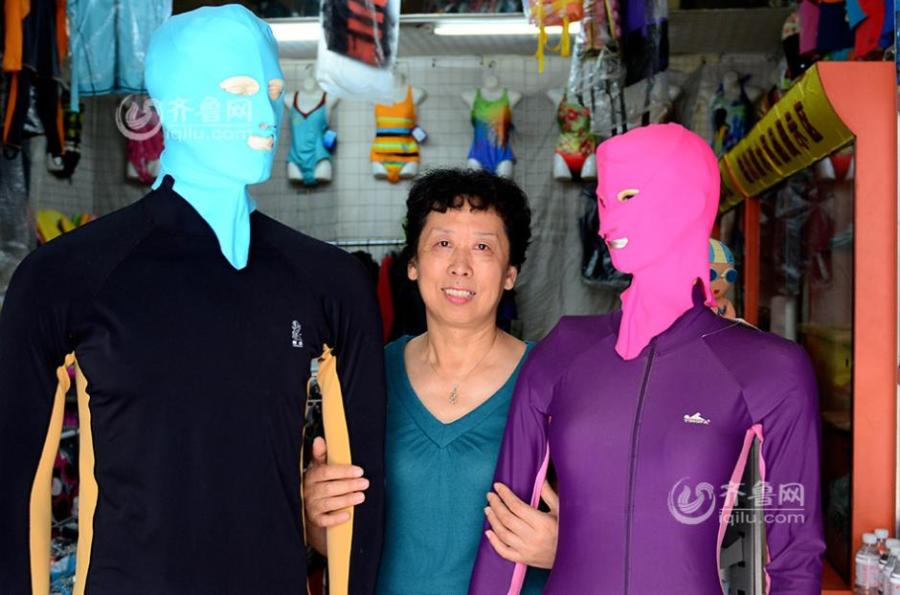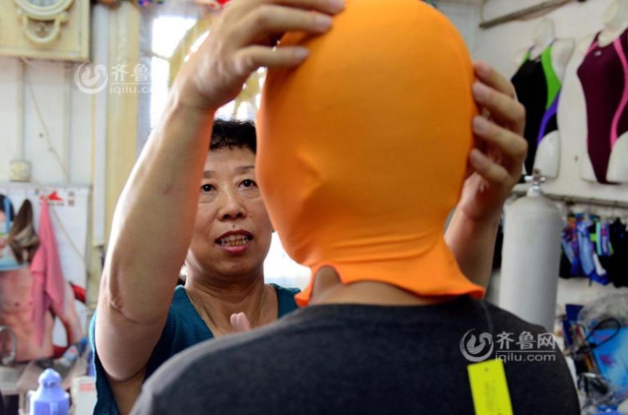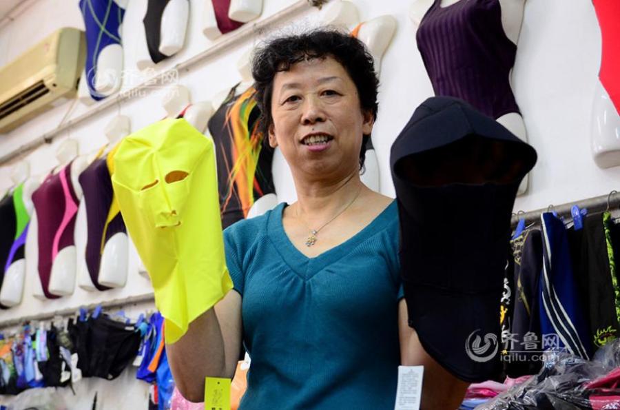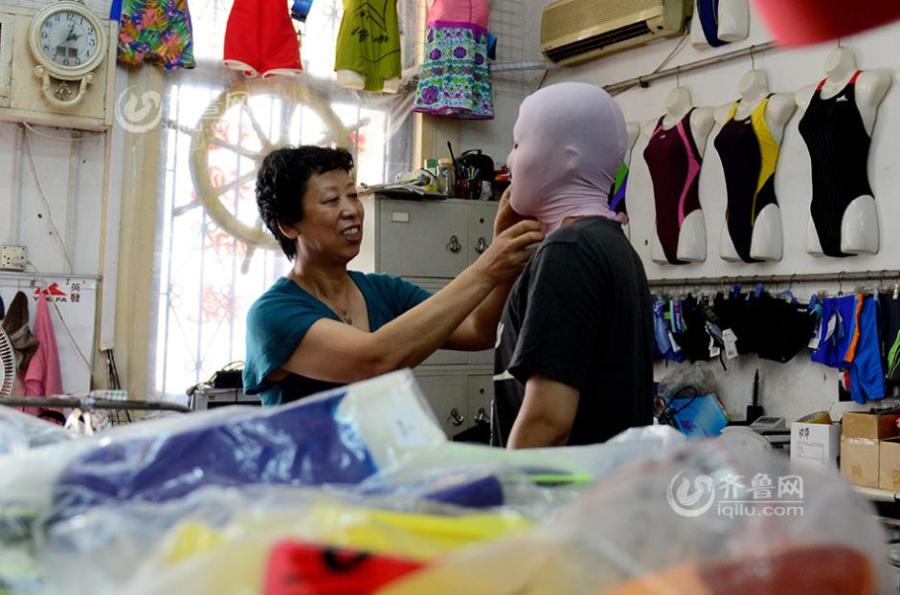 Zhang Shifan, native of Qingdao city, runs a swimsuit store in the coastal city of Shandong province. The 58-year-old woman is recognized as the inventor of facekinis, which arrive on international fashion scene for a facekini-themed photo shoot was released by French magazine CR Fashion Book. After copying the prototype of diving caps, Zhang designed the anti-sunburn and anti-jellyfish mask, which is widely seen in Qingdao city during summers. Most wearers of facekinis are middle-aged women who like swimming but don't want to their skin to get dark. [Photo/iqilu.com]