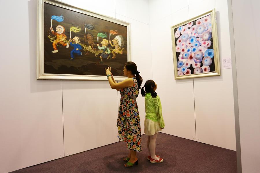 A boy looks at an owl on display at the Nanjing 2014 Grand Art Exhibition, Aug 18, 2014. To share art from different regions during the 2014 Youth Olympic Games, the Nanjing 2014 Grand Art Exhibition is open Aug 18-30. The exhibition showcases more than 500 art works by top-notch artists from over 70 countries and regions, covering traditional Chinese painting, oil painting, sculptures and more. [Photo/Xinhua]