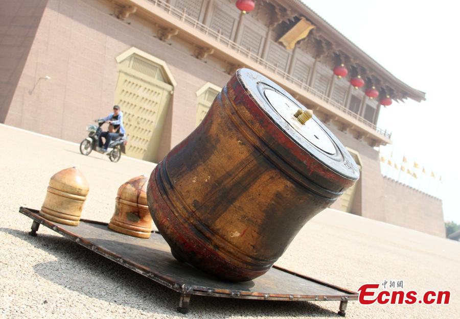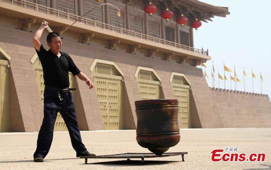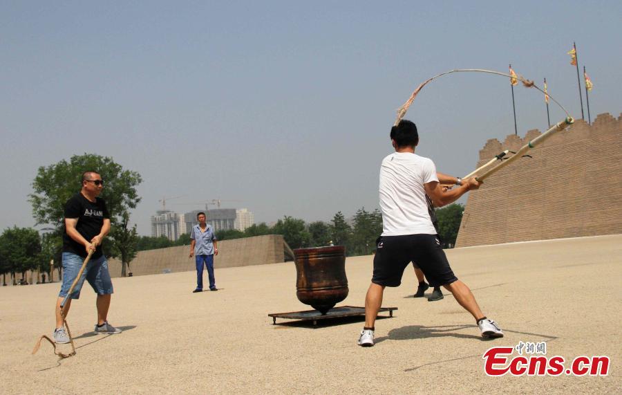 A man whips a huge spinning top in downtown Xi’an, Northwest China's Shaanxi province on August 19, 2014. The huge toy weighed 275 kilograms and required two to three people to keep it spinning. [Photo/ Zhang Yichen]