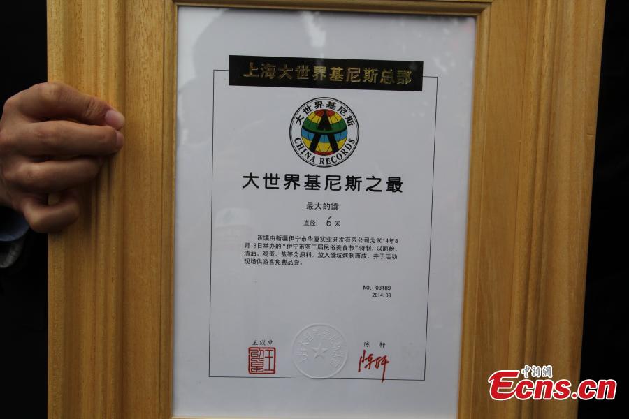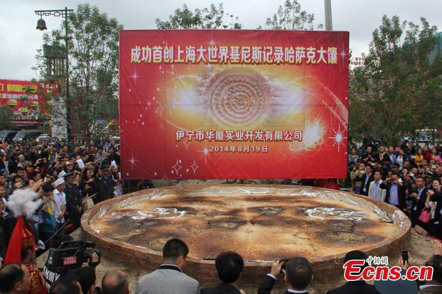 World's largest naan bread is unveiled in Ili Kazakh autonomous prefecture of northwest China's Xinjiang Uygur autonomous region on Aug. 19, 2014. According to the 63-year-old naan baker, the bread, with the diameter of six meters, costs him 860 kilograms of flour and 60 kilograms of oil. It is baked for ten hours in the specially constructed pit.[Photo/Zhu Jingchao]