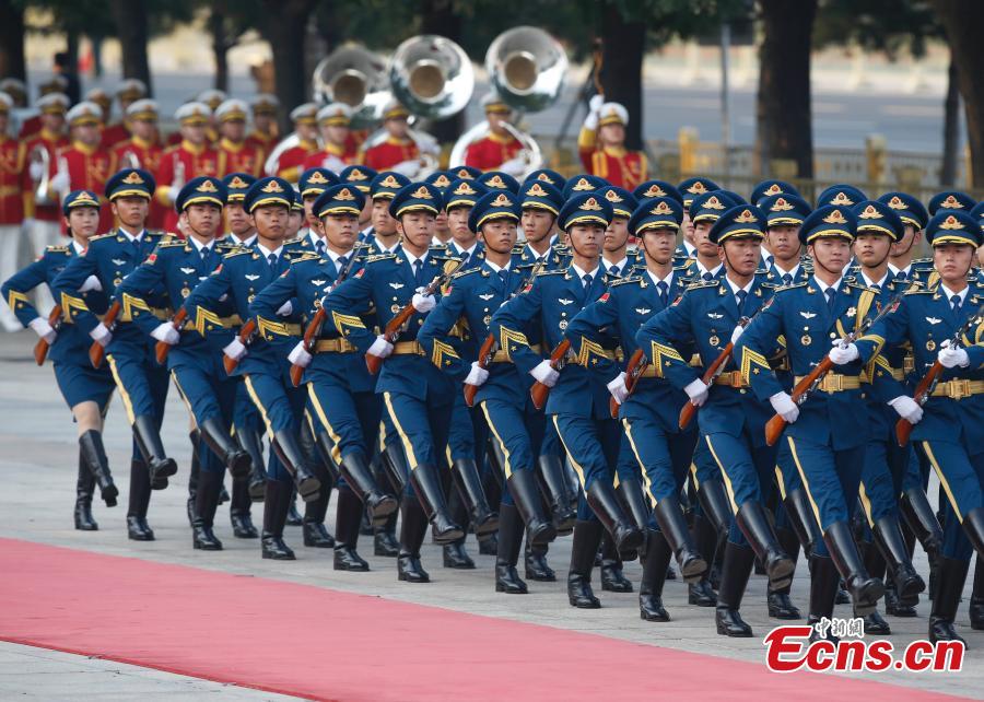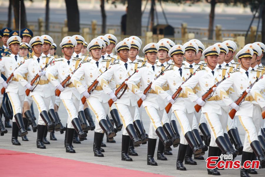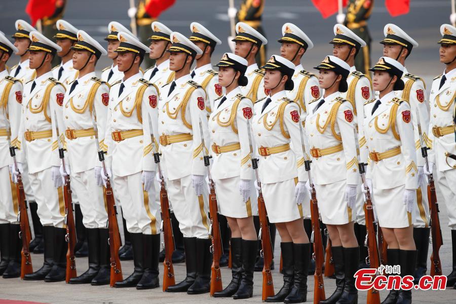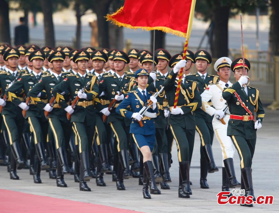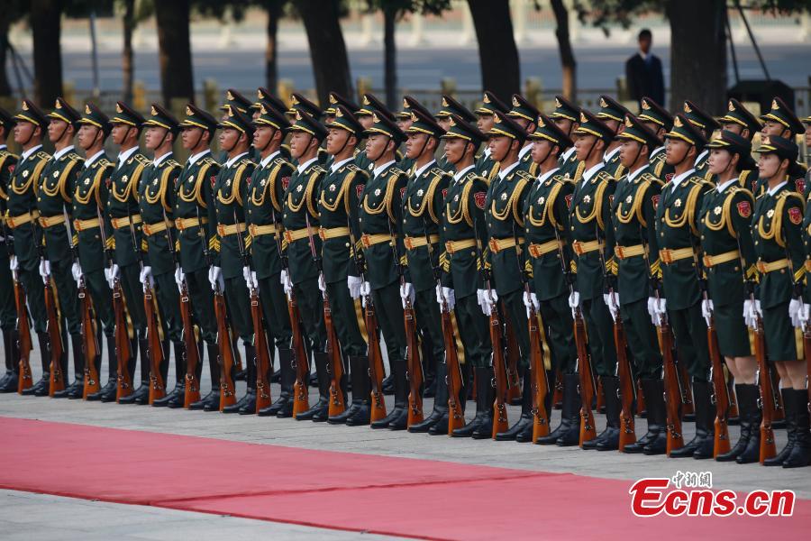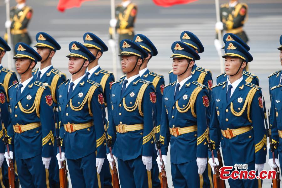 Chinese soldiers in new uniforms perform honor guard duties for Uzbekistan's President Islam Karimov’s welcoming ceremony at the Great Hall of the People in Beijing on Aug. 19, 2014. The honor guards and military bands of the People’s Liberation Army started putting on the new uniforms on Aug. 1 and on Tuesday's ceremony it was their first public appearance with new uniforms. [Photo: China News Service / Du Yang]