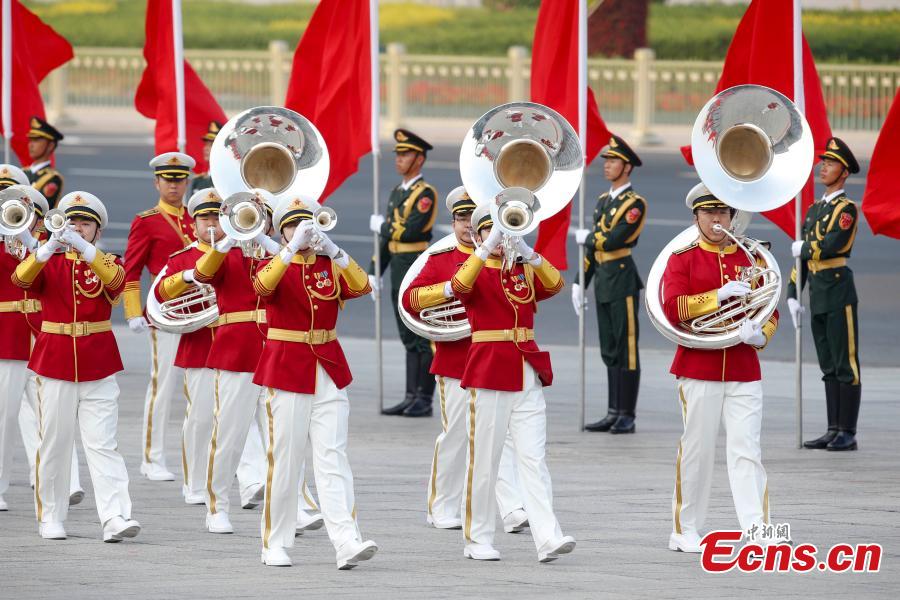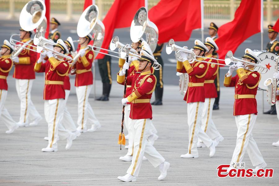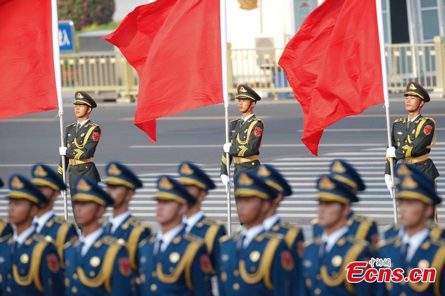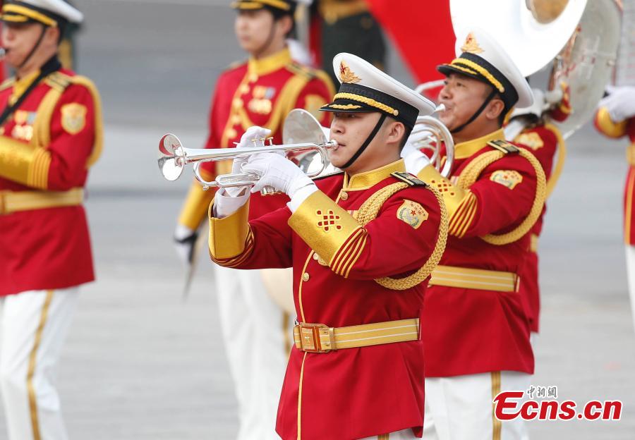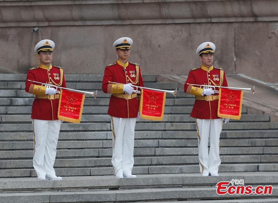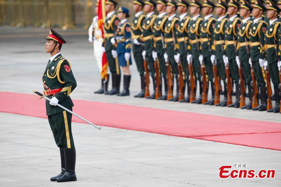 Chinese soldiers in new uniforms perform honor guard duties for Uzbekistan's President Islam Karimov’s welcoming ceremony at the Great Hall of the People in Beijing on Aug. 19, 2014. The honor guards and military bands of the People’s Liberation Army started putting on the new uniforms on Aug. 1 and on Tuesday's ceremony it was their first public appearance with new uniforms. [Photo: China News Service / Du Yang]