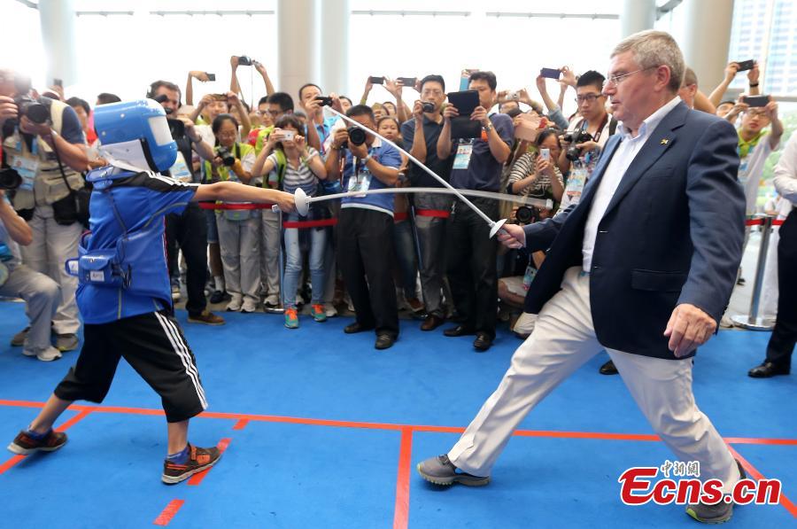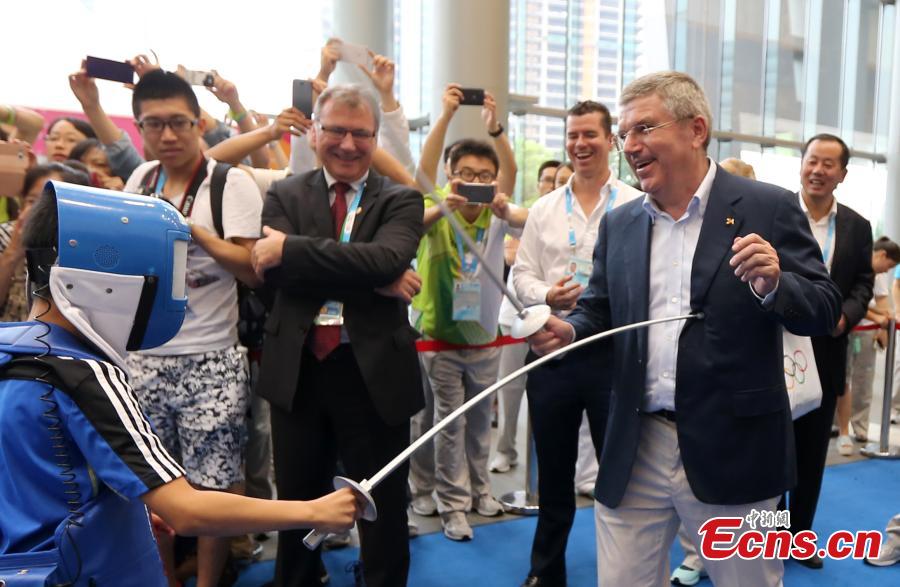 International Olympic Committee President Thomas Bach (R1 front) has a "sword fight" with a young fencing learner during his visit to Nanjing International Expo Center in Nanjing city of east China's Jiangsu province on Aug. 19, 2014. Bach is here for the Nanjing 2014 Youth Olympic Games. In his fencing career, Bach competed at the 1976 Summer Olympics in Montreal and won a gold medal in the team foil event. [Photo: China News Service / Yang Bo]