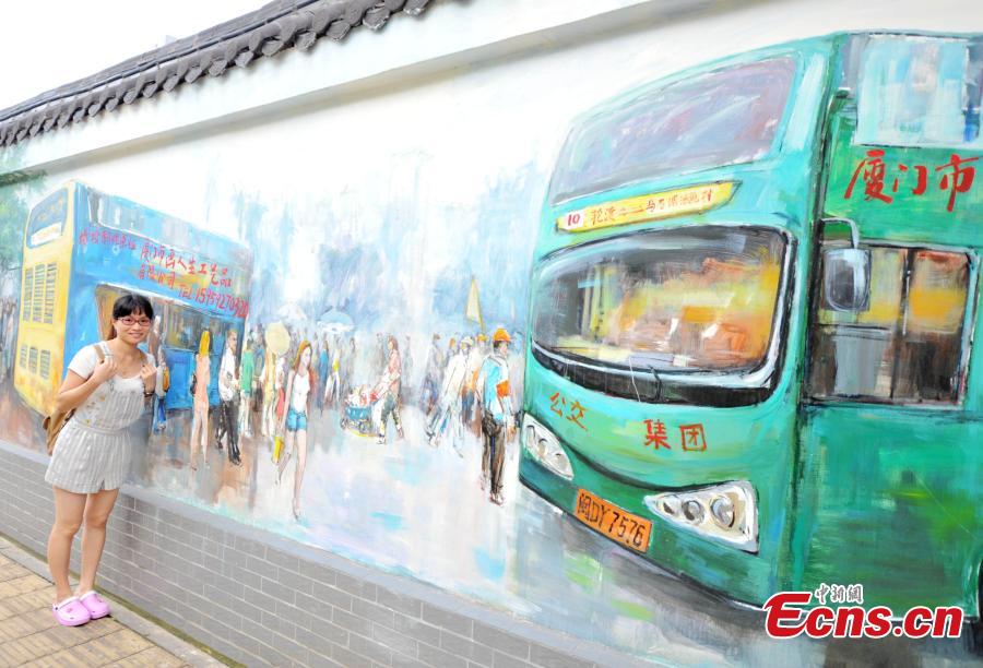 A passer-by views a wall with an oil painting on it at Wushipu village of Huli district in Xiamen city, Fujian province on Aug. 20, 2014. In 1992, over 300 painters entered the village, which is now well-known for oil paintings. Xiamen city is also one of the world's top three largest oil painting production bases. [Photo: China News Service / Zhang Bin]