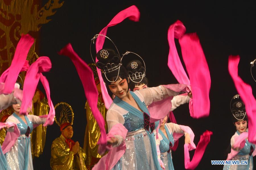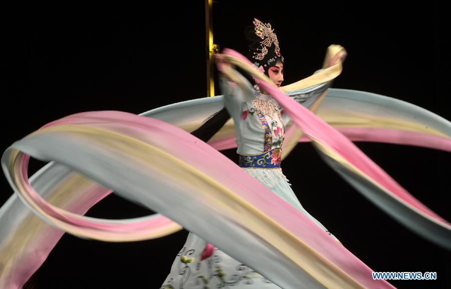 Actress Li Hongyan (C) performs Peking Opera "Resisting Jin Troops" during a preview for media at Lincoln Center in New York City, the United States, Aug. 20, 2014. "120th Anniversary of the Mei Lanfang "project was kicked off here on Wednesday under the leadership of Mei Baojiu, son of famous Peking Opera master Mei Lanfang to commemorate the 120th anniversary of Mei Lanfang and to promote the art of Peking Opera. (Xinhua/Wang Lei)