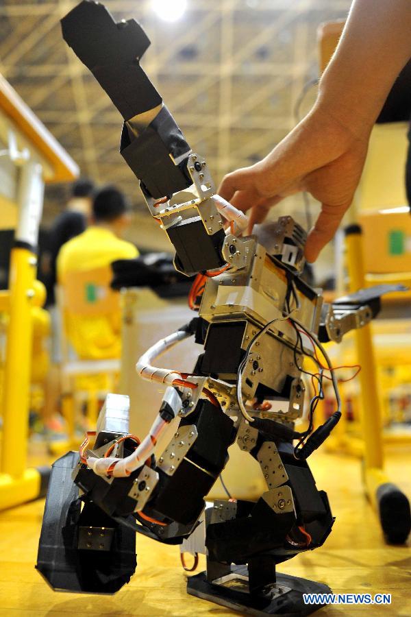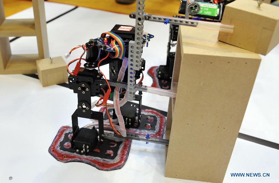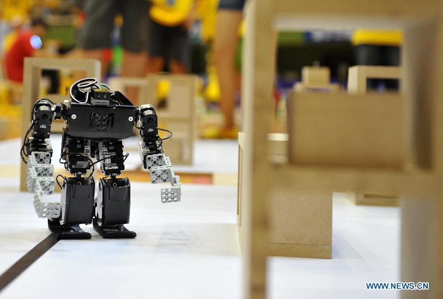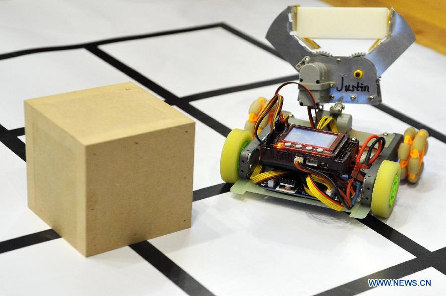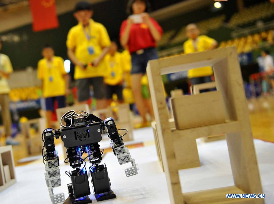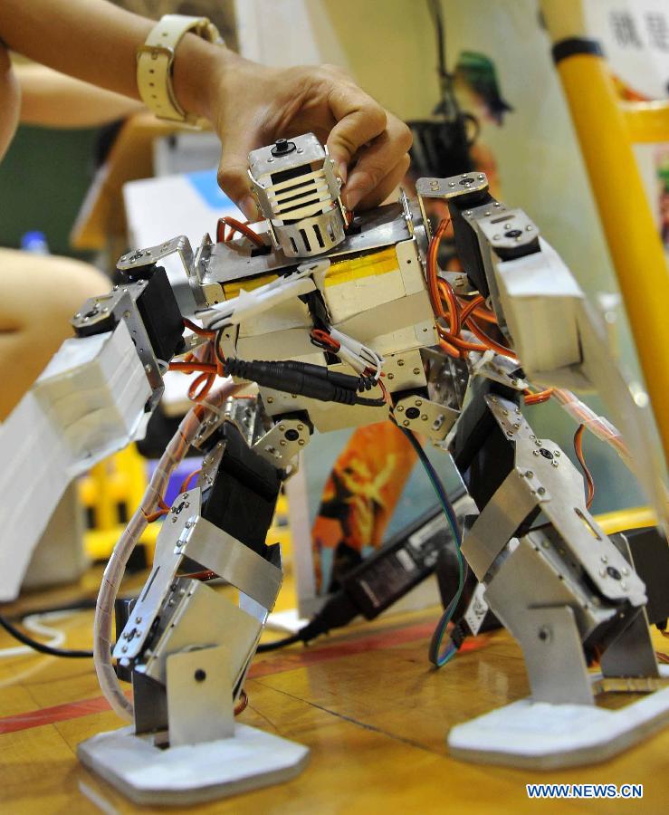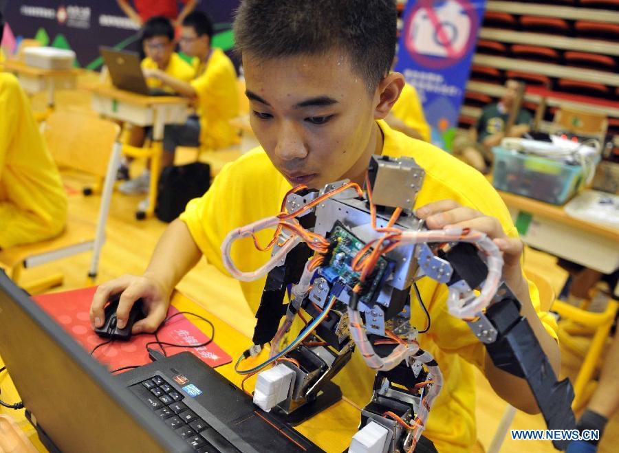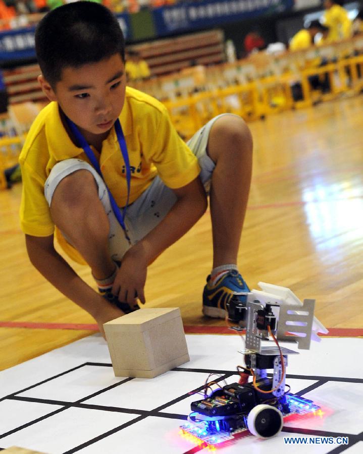 A competitor tests a robot during a regional qualification match for the 16th World Robot Olympiad (WRO) in Beijing, capital of China, Aug. 21, 2014. The event was attended by over 100 robotic match teams in China. Members of the winning teams will be selected to compete as the Chinese national team in the upcoming 16th World Robot Olympiad in Beijing in November. (Xinhua/Gong Lei)