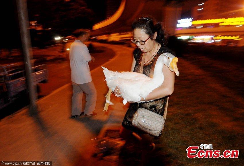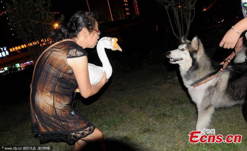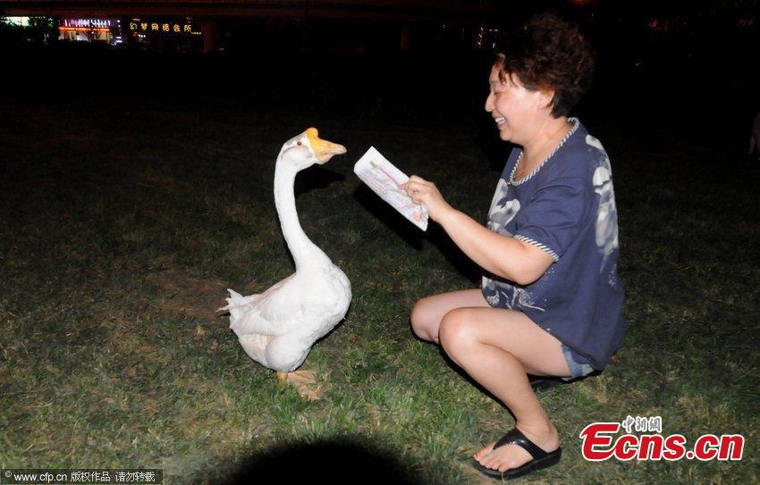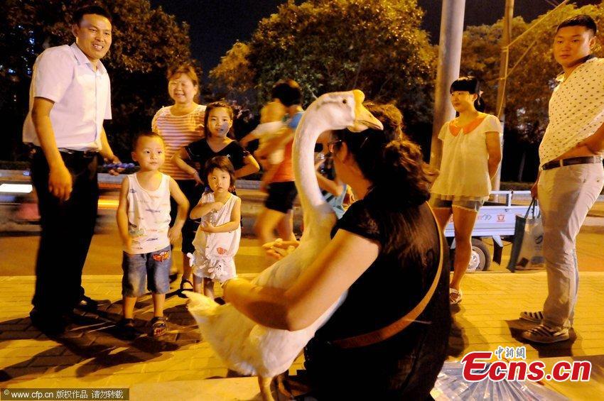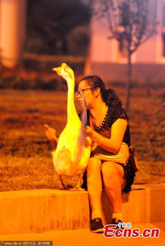 A woman walks her pet - a goose- in Luoyang city of Henan province on Aug.24, 2014. The goose is two years old, according to its owner. [Photo/CFP]