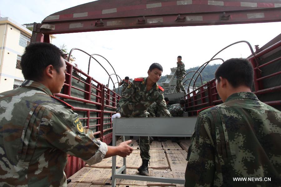 A soldier carries desks to a make-shift classroom at a hope school in the quake-hit Baogunao Township, Qiaojia County, south China's Yunnan Province, Aug. 25, 2014. Mobile classrooms have been set up at the hope school for students to start their new semester. (Xinhua/Zhang Guangyu)